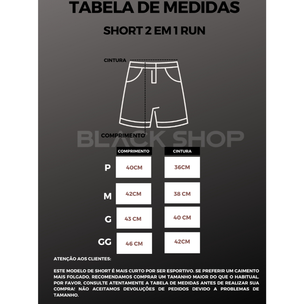 TECIDO: DRY FIT com ELASTANO 🔥 Shorts 2 em 1 – Conforto, estilo e performance em um só produto! Ideal para treinar, correr ou até sair no dia a dia, esse modelo 2 em 1 tem tudo o que você precisa: ✔️ Camada interna de compressão: firme e confortável ✔️ Camada externa soltinha: mais estilo e liberdade de movimento ✔️ Tecido leve com elastano: flexível, confortável e com secagem rápida ✔️ Absorve o suor e protege contra os raios UV ✔️ Bolso interno: perfeito para guardar chave, cartão ou celular com segurança 🚫 Não possui alça para toalha 📏 Tabela de Medidas (Modelo mais curto e justo) 👉 Se quiser mais soltinho, escolha um número maior que o de costume. P Cintura: 36 cm | Comprimento: 35 cm Indicado para quem veste 36-38 Até 1,65m | até 65kg M Cintura: 38 cm | Comprimento: 39 cm Veste 38-40 Altura entre 1,65m e 1,75m | até 75kg G Cintura: 40 cm | Comprimento: 39 cm Veste 42-44 Altura entre 1,75m e 1,85m | até 85kg GG Cintura: 41 cm | Comprimento: 46 cm Veste 44-46 Acima de 1,80m | até 100kg ⚠️ Importante: Confira bem a tabela antes de comprar. ❌ Não aceitamos troca por tamanho errado.