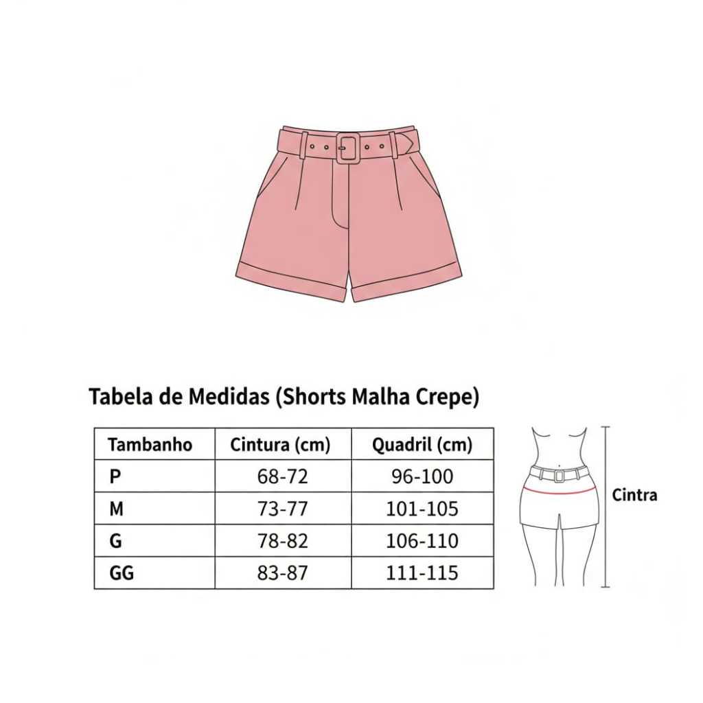 Shorts Cintura Alta em Malha Crepe com Fivela Encapsulada Conforto e estilo em uma só peça! Este shorts é confeccionado em malha crepe de alta qualidade, que garante caimento leve e elegante. Possui modelagem de cintura alta que valoriza a silhueta , trazendo um toque sofisticado ao visual. 🔹 Tecido: Malha Crepe 🔹 Modelagem: Cintura Média 🔹 Detalhe: Fivela encapsulada 🔹 Bastante elastano 🔹 Ocasiões: Passeios, eventos casuais e produções estilosas TAMANHOS ✅ M VESTE 36-38 ✅ G VESTE 40-42 ✅ GG VESTE 44-46 Todos os nossos produtos são a PRONTA ENTREGA, portanto após a confirmação do pagamento, enviaremos se pedido em até 1 dia útil! Qualquer dúvida nos chame no chat, será um prazer atende-lo!