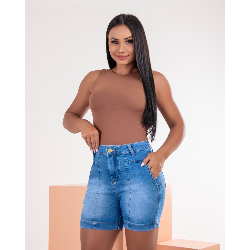 Shorts Jeans Feminino Meia Coxa Com Lycra Cintura Alta