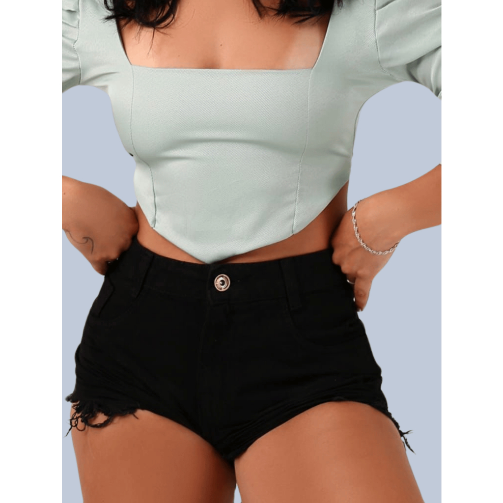 Shorts Jeans Feminino Preto Curto Cintura Alta Destroyed Hot Pants Desfiado Blogueira