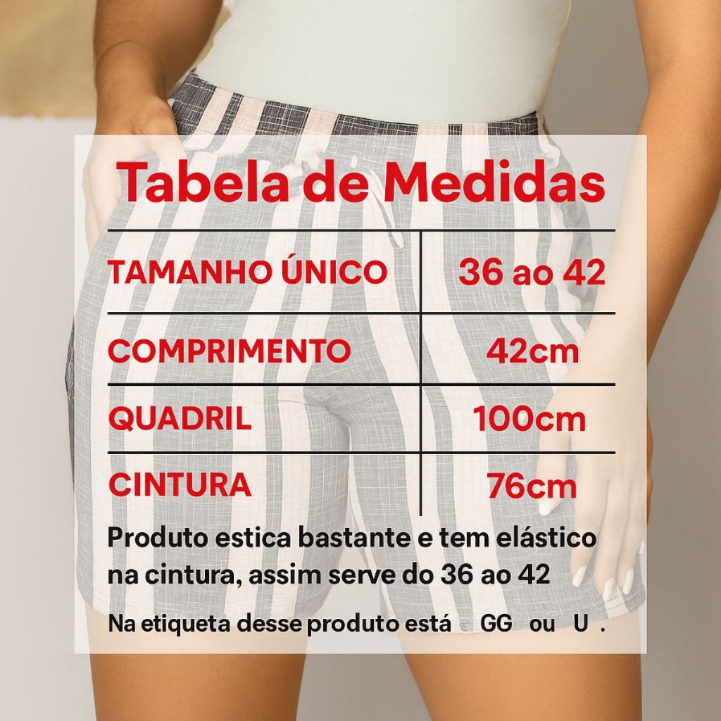 º Um Shorts de alta qualidade e luxo para compor um look com estilo e com conforto. possui elástico de ajuste na cintura, dois bolsos frontais e um cordão fake na frente. Não fica transparente. º ATENÇÃO; DEIXAMOS NA VARIAÇÃO DO NOSSO ANÚNCIO A ESCOLHA DE UNIDADES QUE DESEJA! º ENVIAMOS CORES VARIADAS ENTRE LISO, LISTRADO E FLORAL º O nosso modelo possui um tamanho ÚNICO que atende as numerações do 36 ao 42. º Tabela de medidas: Comprimento = 42cm Quadril = 100cm Cintura = 76cm º ATENÇÃO: O NOSSO PRODUTO ESTICA BASTANTE E TEM ELASTICO NA CINTURA, ASSIM SERVE DO 36 AO 42. º NA ETIQUETA DO NOSSO PRODUTO ESTÁ MARCADO COMO "GG" OU "U" EM TODOS OS TAMANHO !!! º Composição: 95% algodão e 5% elastano. º Qualquer Dúvida Sobre o(s) Produto(s), Envie Uma Mensagem Em Nosso Chat Que Responderemos de imediato! º O Poder Está Em Você!