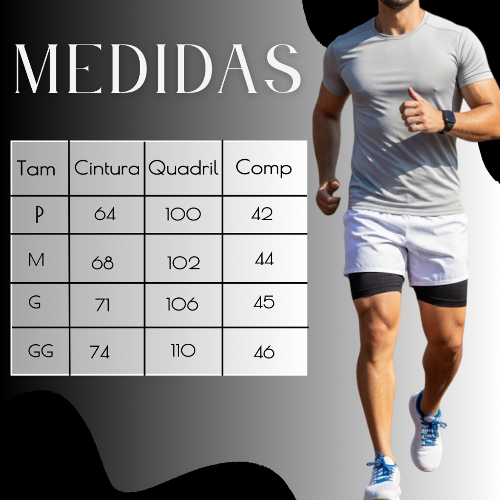 Shorts de Corrida 2 em 1 com Compressão Este shorts foi projetado para oferecer o máximo de performance e conforto durante atividades físicas intensas, como corrida, musculação e treinos funcionais. O design combina a leveza de um shorts de treino tradicional com o suporte técnico de uma bermuda térmica interna. Destaques do Produto Design Duplo (2 em 1): Possui uma camada externa em tecido leve e fluido que permite total liberdade de movimento, sobreposta a uma bermuda de compressão interna. Bermuda de Compressão Interna: Fabricada em material elástico que se ajusta perfeitamente ao corpo, ajudando a reduzir a fadiga muscular e evitar o atrito entre as coxas, comum durante corridas. Armazenamento Inteligente: A camada interna de compressão inclui um bolso lateral embutido, ideal para carregar com segurança itens como celular, chaves ou géis de carboidrato durante o exercício. Ajuste Personalizado: O cós é feito de elástico reforçado, garantindo que a peça permaneça no lugar mesmo em movimentos de alto impacto. Acabamento Premium: Apresenta uma fenda lateral discreta para aumentar a amplitude de movimento e o logotipo da marca aplicado de forma minimalista. Benefícios para o Atleta Conforto Térmico: Os tecidos facilitam a evaporação do suor, mantendo o corpo seco por mais tempo. Versatilidade: O visual moderno permite o uso tanto em ambientes de performance técnica (pistas de atletismo) quanto em treinos casuais na academia. Segurança: O bolso interno firme evita que o celular balance ou caia durante a corrida. Guia de Medidas (em centímetros) Para garantir o ajuste ideal e o melhor desempenho da bermuda de compressão interna, utilize as medidas abaixo como referência: Tamanho P: Cintura: 64 cm Quadril: 100 cm Comprimento: 42 cm Tamanho M: Cintura: 68 cm Quadril: 102 cm Comprimento: 44 cm Tamanho G: Cintura: 71 cm Quadril: 106 cm Comprimento: 45 cm Tamanho GG: Cintura: 74 cm Quadril: 110 cm Comprimento: 46 cm