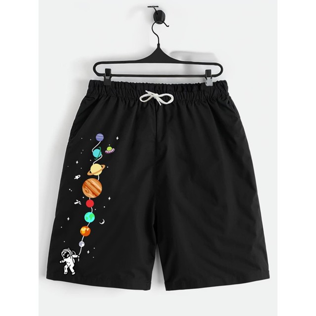 Shorts Preto Bermuda Calção Verão Astronauta Flutuando Estampado Infantil Juvenil