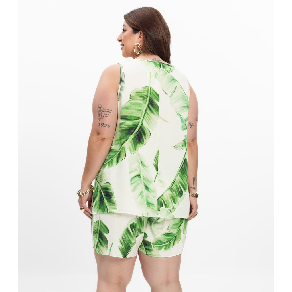 Shorts Saia Feminino Plus Size Secret Glam, confeccionado em viscose Khyara acetinada com estampa rotativa exuberante. Possui revel entretelado com pesponto interno e acabamento limpo, recorte duplo fixo com pesponto, franzido e prolongamento frontal formando nó com pontas chanfradas. Abertura frontal com transpasse, bainha na barra para caimento impecável e costas com cós de elástico rebatido. Peça sofisticada, perfeita para looks elegantes e tropicais em ocasiões ao ar livre.