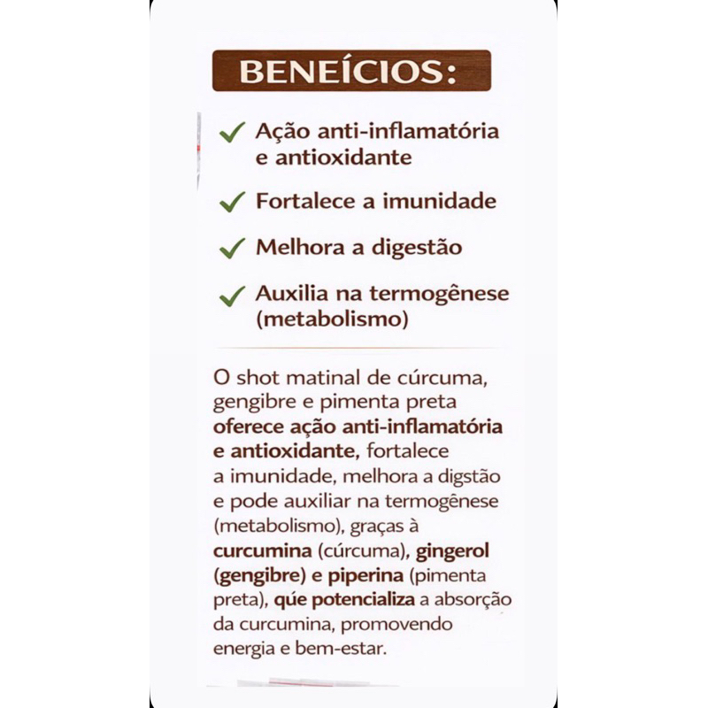 Shot Matinal Gengibre, Açafrão e Pimenta Preta. sachê individual. Contém 30 saches. Instrução de uso: tomar 1 sachê ao dia, diluído em água ou suco de limão.