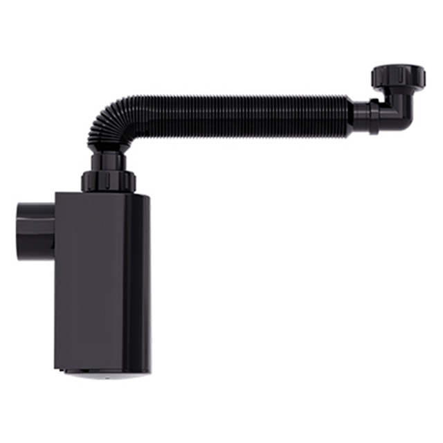 Sifão Com Copo De Parede Tubo Extensivo Preto - Blukit Este sifão, além de muito bonito, permite uma fácil limpeza dos resíduos que caem no sifão, pois seu copo rosqueável é facilmente removível. Desta forma, não é preciso remover todo o sifão para realizar a limpeza. É um sifão flexível e ajustável, além de não permitir que o cheiro do esgoto retorne para o ambiente. Características: - Acabamento: preto - Comprimento: 440mm (máx) 330mm (min) - Dimensão do Copo: 135mm Altura X 60mm Largura X 60mm Profundidade - Diâmetros de saída: DN38 - Rosca (G): 1.1/2 x 1.1/4 x 7/8 Material: - Plásticos de engenharia e elastômeros Conteúdo da embalagem: - 01 sifão copo de parede