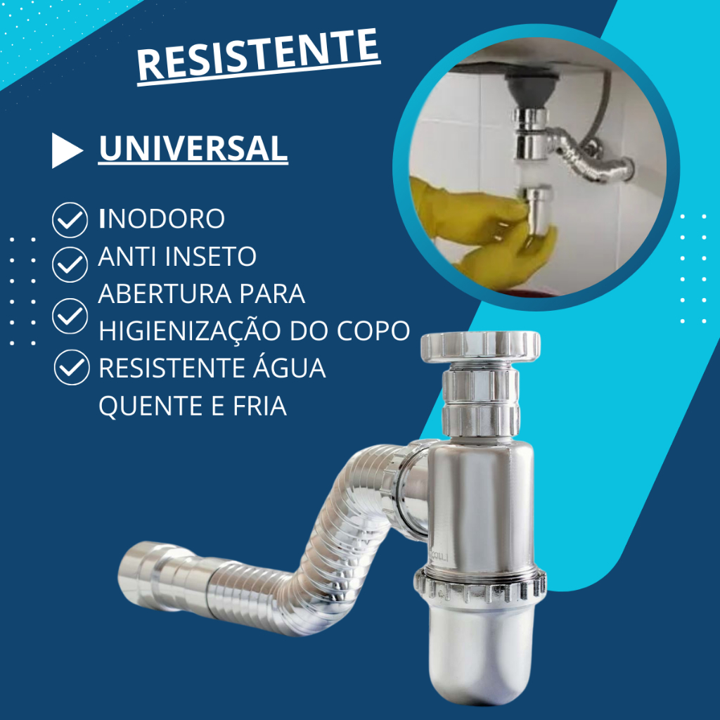 Sifão Copo Flexível de Pia. Peça chave na instalação de cubas e pias e de forma moderna e prática. Plástico resistente de engenharia, metalizado cromado. Contém Adaptadores para: pia de cozinha americana, entrada 1.1/2 lavatório de banheiro, entrada 7/8 ou 1' tanque, entrada 1.1/4 Diâmetro de Saída 38/40/48/50'. -Fácil Manutenção; - Instalação manual ; - Suporta água até 90ºC; - Anti Odor; - Ideal para tanques, pias e cubas; - Possui copo que facilita a limpeza e - Corrige desalinhamento entre cuba e tubulação de despejo.