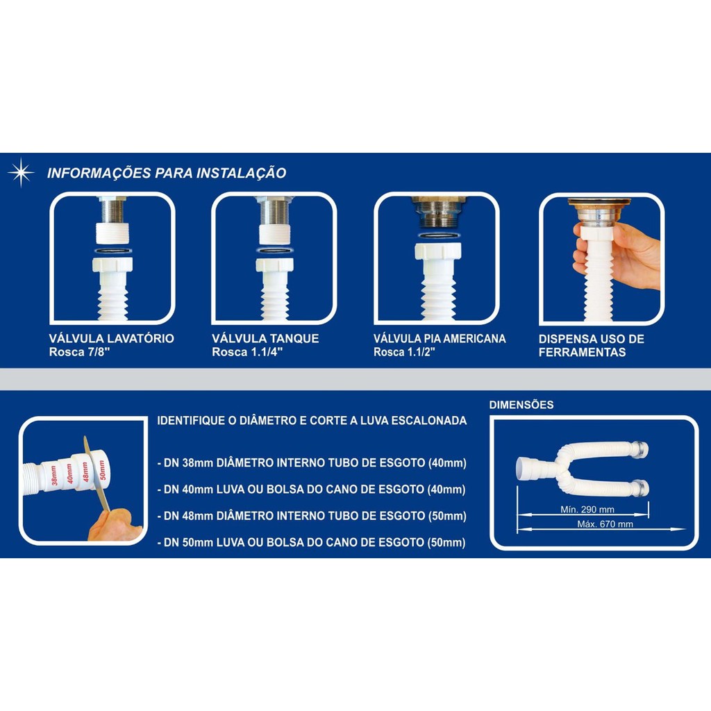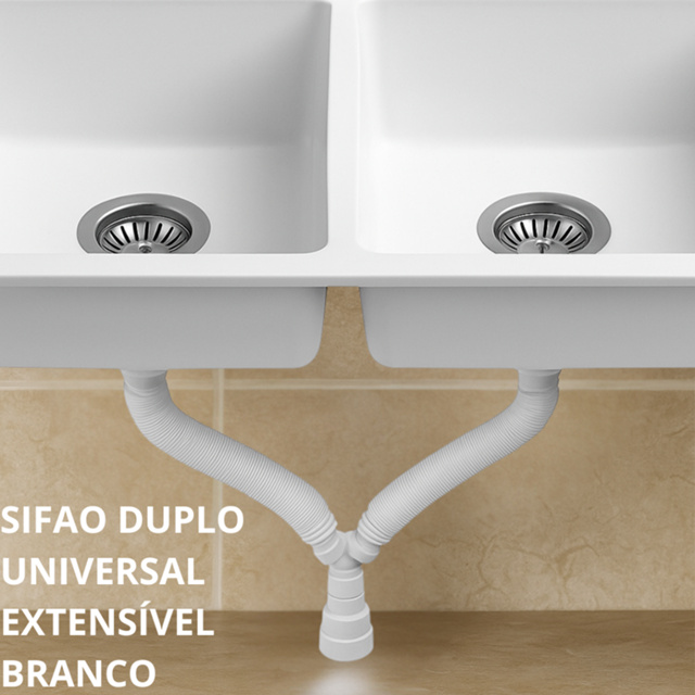 Sifão Duplo Universal Extensível Multiuso Corrugado Branco Banheiro Lavabo Cozinha