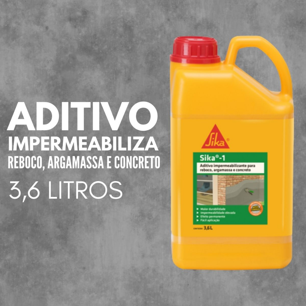 VALIDADE 18 MESES Sika 1 é um impermeabilizante de pega normal para argamassa e concreto, que reage com o cimento durante o processo de hidratação, dando origem a substâncias minerais que bloqueiam a rede capilar, proporcionando elevada impermeabilidade à argamassa e concreto. UTILIZAÇÕES: O revestimento com Sika 1 tem grande durabilidade, uma vez que é totalmente mineral. Sua ação não diminui com o tempo, isto é, seu efeito é permanente. Proporciona elevada impermeabilidade à argamassa e concreto. Por ser líquido, é de fácil mistura e dosagem. Não altera os tempos de pega (início e fim). Reduz a permeabilidade. Confere maior durabilidade. CARACTERISTICAS: O revestimento com Sika 1 tem grande durabilidade, uma vez que é totalmente mineral. Sua ação não diminui com o tempo, isto é, seu efeito é permanente. Proporciona elevada impermeabilidade à argamassa e concreto. Por ser líquido, é de fácil mistura e dosagem. Não altera os tempos de pega (início e fim). Reduz a permeabilidade. Confere maior durabilidade. Uso Rebocos internos e externos Revestimentos impermeáveis em: subsolos, fundações, pisos e paredes em contato com umidade do solo, piscinas, reservatórios e caixas de água, túneis e galerias. Muros de arrimos Argamassa de assentamento de blocos e tijolos para evitar umidade ascendente Concreto impermeável Obs: Não recomendamos o uso do Sika® 1 no concreto armado ou protendido. Embalagem Saco com 1L / Bombona com 3,6L / Balde com 18L