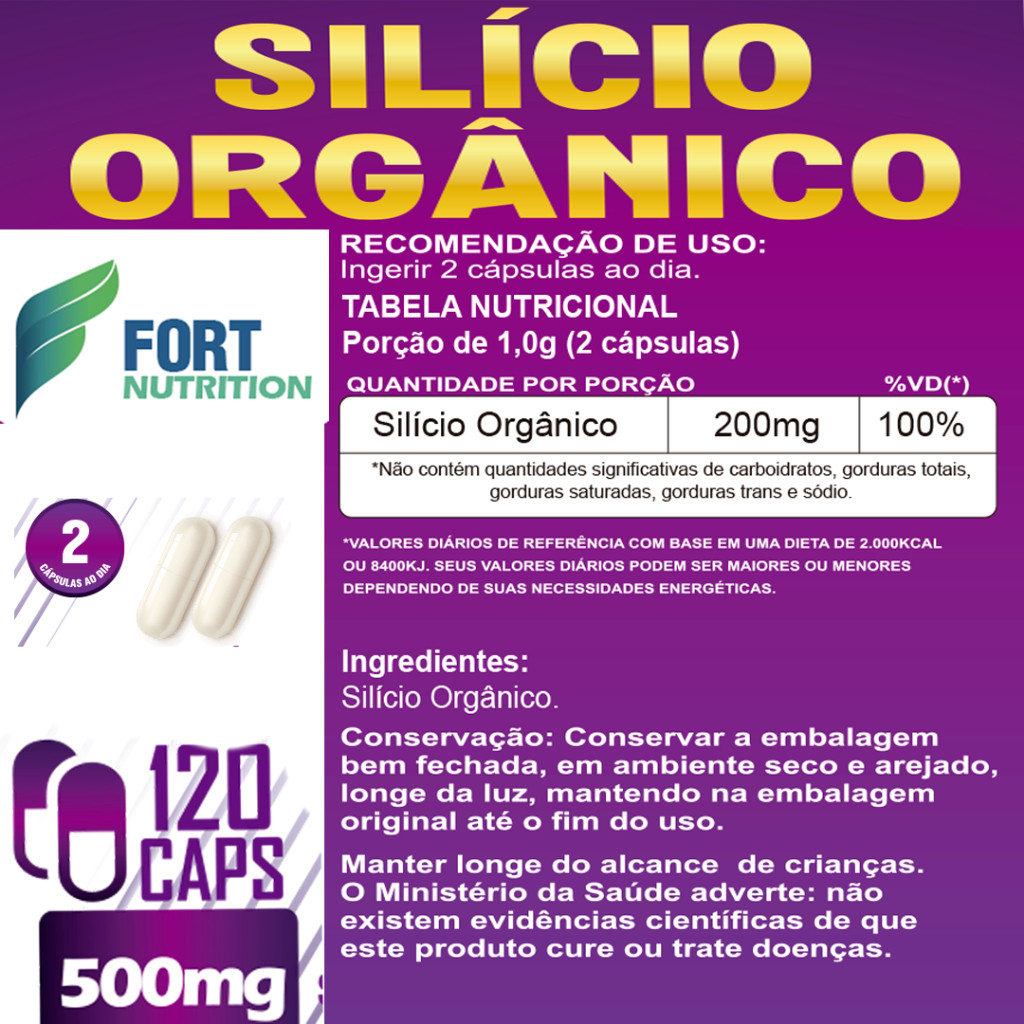 O silício orgânico é um suplemento alimentar indicado para aumentar a elasticidade da pele e fortalecer as articulações, pois contribui para a síntese de colágeno, elastina e ácido hialurônico, que são fundamentais para o bom funcionamento dos ossos e das articulações e exercendo também uma ação regeneradora e reestruturante da pele. Além disso, o silício orgânico é considerado um agente antienvelhecimento natural para as paredes das artérias, pele e cabelos, contribuindo também para a renovação celular e para reforçar as células do sistema imunológico. As principais indicações do silício orgânico são: Rejuvenescer e aumentar a elasticidade da pele; Tonificar e reestruturando a pele, atenuando as rugas e linhas de expressão; Fortalecer as unhas e o cabelo; Fortalecer as articulações, melhorando a mobilidade e a flexibilidade; Melhorar a saúde dos ossos, já que contribui para a calcificação e mineralização óssea; Reforçar a parede das artérias, tornando-as mais flexíveis; Prevenir o envelhecimento precoce; Fortalecer o sistema imunológico. Não exceder a recomendação diária de consumo indicado na embalagem. Mantenha fora do alcance de crianças. Gestantes, lactantes e crianças até 3 anos somente devem consumir este produto sob orientação de nutricionista ou médico. IMPORTANTE: Produto autorizado para comercialização em todo o território nacional através do anexo I da RDC 240/2018 ANVISA.
