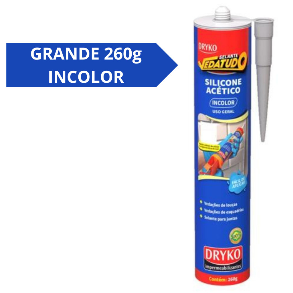 Silicone Acético embalagem com 50g ou 260g - Acabamento Branco ou Incolor Silicone monocomponente acético com fungicida que cura com a temperatura ambiente através da umidade do ar e se torna uma borracha flexível. ONDE APLICAR: Calafetação de esquadrias (portas e janelas); Vedação de pias, cubas e bacias; Selante para juntas; Vedação de azulejos; Aplicações em vidros; Box de banheiro e alumínio. VANTAGENS: Não amarela com o passar do tempo; Alta aderência e resistência; Fácil aplicação; Aplicado em áreas horizontais e verticais; Produto atóxico; Antimofo e Antifungo; Áreas internas e externas. PREPARO DA SUPERFICIE: O substrato para aplicação do DRYKOSELANTE VEDATUDO SILICONE ACÉTICO deve ser limpo, seco, isento de corpos estranhos, restos de formas, pontas de ferragem, restos de produtos desmoldantes ou impregnantes, falhas e nichos. Em concretos lisos realizar lixamento com escova de aço ou mecanicamente para aber tura de porosidade e remoção de desmoldantes ou agente de cura. Se necessário lixar a superfície de aplicação. APLICAÇÃO DO PRODUTO: Cortar o bico plástico na altura da rosca interna e rosquear o bico aplicador, cortar o bico em um ângulo de 45° na altura compatível com a espessura de aplicação desejada. Execute a aplicação com um aplicador manual ou pneumático. Aplicar o produto na área desejada e realizar o acabamento imediatamente, no caso de uso da fita adesiva remover antes da formação de película do produto. Após o uso, manter o bico aplicador no cartucho e deixar uma pequena quantidade de produto acima do bico para formar um tampão, na reutilização retirar o tampão. Após aber to utilizar o produto em até duas semanas. LIMPEZA A limpeza de ferramentas e equipamentos pode ser realizada com solvente antes da secagem do produto, após secagem a remoção deve ser realizada mecanicamente.