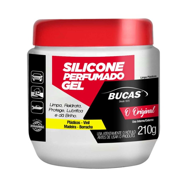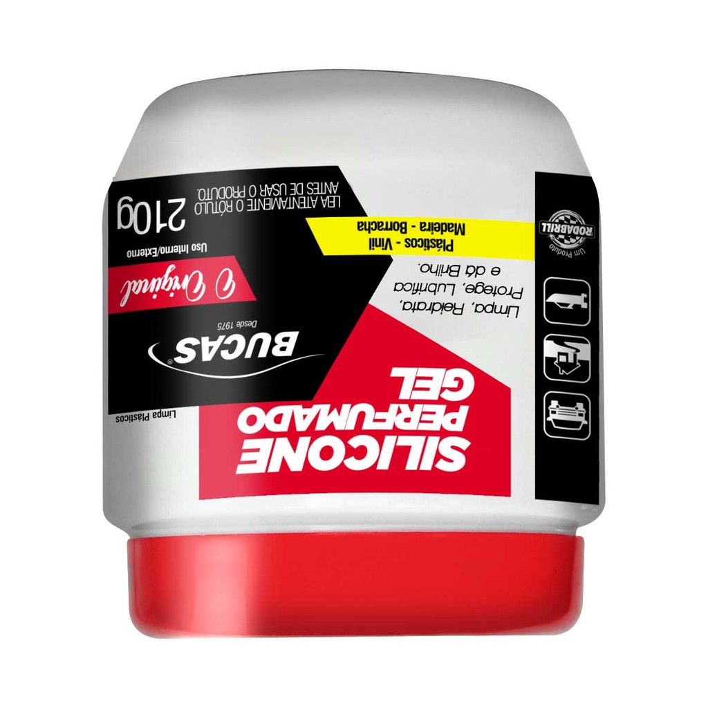 Silicone Perfumado Gel Bucas 210g O SILICONE GEL BUCAS dá brilho nas partes plásticas, borrachas, madeira de acabamento e vinil sem engordurar. Deixa a superfície como nova com um excelente acabamento. Aplicação: SILICONE BUCAS GEL proporciona brilho sem deixar resíduos gordurosos em partes plásticas, borrachas, madeiras de acabamento, couro e vinil. Proporciona à superfície um aspecto revitalizado com um acabamento de excelência. Pode ser aplicado também em pneus, para-choques e frisos para prevenir o ressecamento da borracha. Modo De Usar: Utilize uma esponja seca para espalhar o produto por toda a superfície previamente limpa e aguarde a secagem. Para finalizar, utilize um pano limpo e seco para dar o acabamento. Não aplicar em pedais de comando para evitar que se tornem escorregadios.