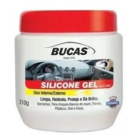 SILICONE GEL BUCAS (210 GR) RODABRILL Silicone Gel Bucas dá brilho sem engordurar nas partes plásticas, borrachas, couro e vinil. Deixa a superfície como nova com um excelente acabamento. Use também em pneus, pára-choques e frisos para evitar que a borracha fique ressecada. MODO DE USAR: 1. Aplique o Silicone em uma esponja e distribua uniformemente sobre a superfície desejada. 2. Aguarde secar por alguns minutos. 3. Dê acabamento passando uma flanela limpa. Não aplicar em pedais e volantes, pois se tornam escorregadios. DICA DE USO:Use o Silicone para proteger painéis, pára-choques, plásticos, artigos de borracha, couro, vinil e courvin com um brilho intenso, sem engordurar e com secagem instantânea.