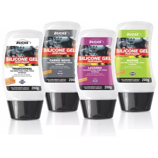SILICONE GEL BUCAS marine (200 GR) RODABRILL Silicone Gel Bucas contem Protetor U.V alem disso dá brilho sem engordurar nas partes plásticas, borrachas, couro e vinil. Deixa a superfície como nova com um excelente acabamento. Use também em pneus, pára-choques e frisos para evitar que a borracha fique ressecada. MODO DE USAR: 1. Aplique o Silicone em uma esponja e distribua uniformemente sobre a superfície desejada. 2. Aguarde secar por alguns minutos. 3. Dê acabamento passando uma flanela limpa. Não aplicar em pedais e volantes, pois se tornam escorregadios. DICA DE USO:Use o Silicone para proteger painéis, pára-choques, plásticos, artigos de borracha, couro, vinil e courvin com um brilho intenso, sem engordurar e com secagem instantânea.