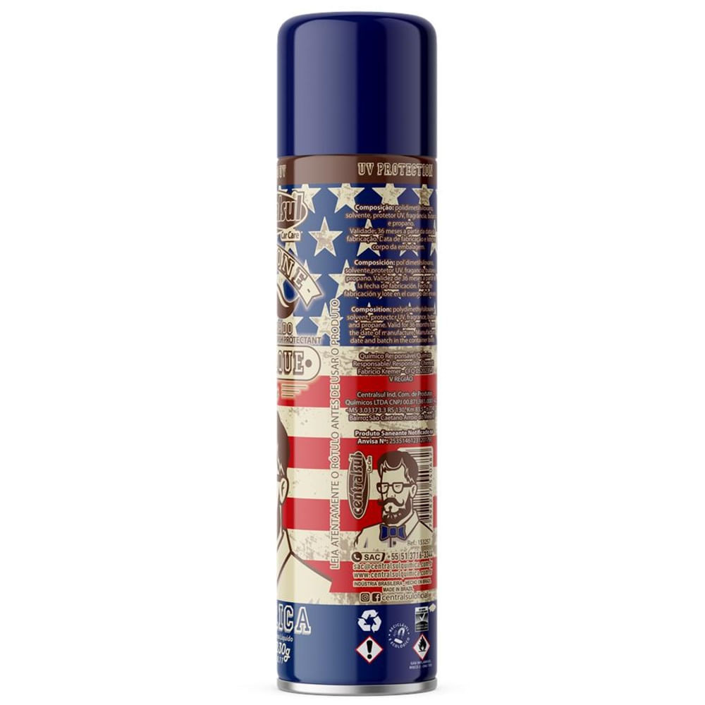 Silicone Aerossol Men America 400ml Brilho Seco – Proteção UV O Destaque Silicone Perfumado Men penetra e trata as superfícies do veículo, recuperando o brilho e a beleza original do painel deixando agradável perfume dentro do veículo. destaque Silicone Perfumado Men é o produto ideal para proteger, conservar e dar brilho ao seu veículo. Cód. Barras 7898227540682