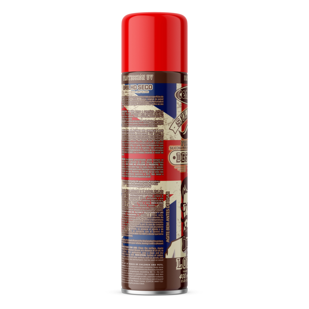 SILICONE SPRAY Perfumado VANTAGENS: Proteção UV. Penetra e trata as superfícies do veículo, recuperando o brilho e a beleza original do painel deixando um agradável perfume dentro do veículo, sendo o produto ideal para proteger, conservar e dar brilho. O seu formato em aerossol proporciona uma melhor cobertura e mais facilidade na aplicação. APLICAÇÕES Pode ser utilizado em superfícies de borracha, vinil, plástico, madeira e outras superfícies de painéis, frisos laterais, console, pneus e para-choques. Pode ser usado em móveis de madeira. CUIDADOS Deve-se evitar o contato do produto com vidros automotivos. Evitar ser aplicado em pisos, pedais e estofados de couro a fim de evitar uma ação derrapante. MODO DE USAR Limpa-se a superfície e aplica-se o Destaque Silicone Perfumado a uma distância de 20 cm, para que fique uniforme. Após à aplicação, dar acabamento com pano de microfibra limpa e seca