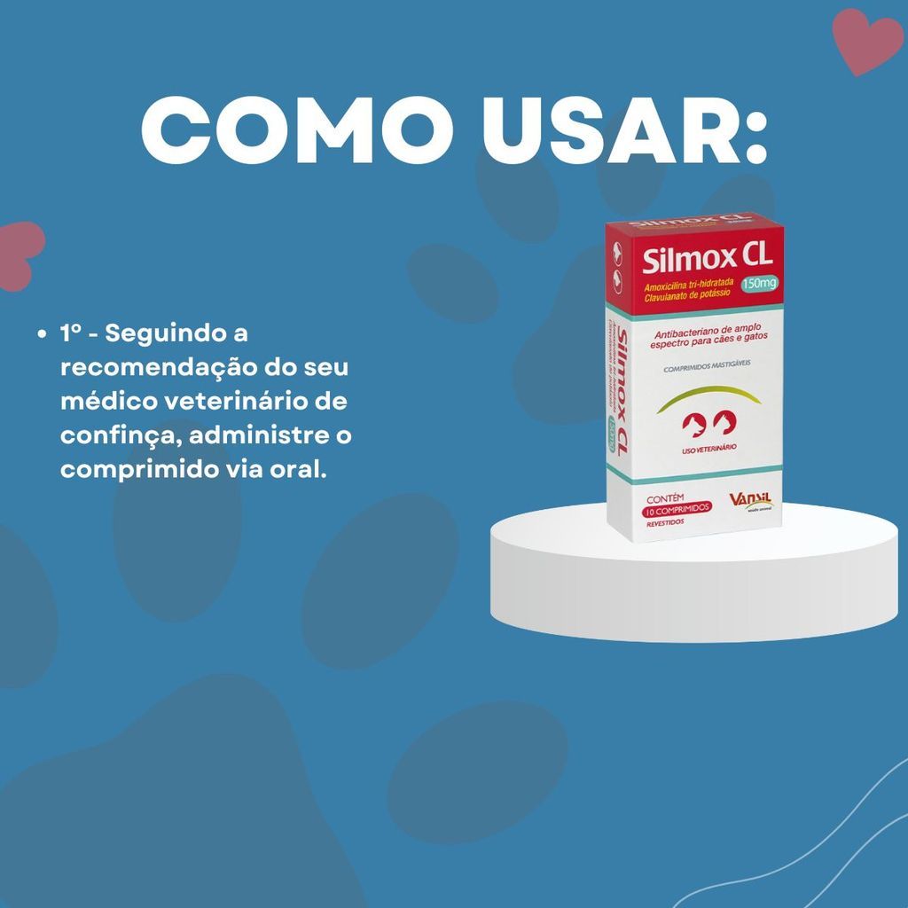 Silmox CL antibiótico à base de Amoxicilina Tri-hidratada e Clavulanato de Potássio que vale por 10 no combate à infecções em cães e gatos. É indicado para infecções orais e periodontais, respiratórias, geniturinárias, gastrointestinais, dérmicas, de ouvido, hepatobiliares, abscessos e feridas, cirurgias dos tecidos moles e cirurgias ortopédicas. Silmox CL apresenta um amplo espectro de atividade, atuando contra bactérias Gram+ e Gram- (inclusive cepas produtoras de beta-lactamases). Tal característica, associada a excelente distribuição e persistência da associação Amoxicilina e Ácido Clavulânico no organismo animal, permitem a utilização do medicamento nos variados processos infecciosos de cães e gatos, tais como: infecções periodontais (cepas sensíveis de bactérias aeróbicas e anaeróbicas), piodermites e infecções dos tecidos moles (Staphylococcus aureus, Staphylococcus epidermidis, Staphylococcus intermedius, Escherichia coli, Proteus spp, Pasteurella spp, Streptococcus spp, Corynebacterium spp, Bacillus spp, Fusobacterium necrophorum, Moraxella spp), infecções do trato urinário (incluindo aquelas causadas por cepas sensíveis de: Escherichia coli), infecções respiratórias (produzidas por: Staphylococcus spp, Pasteurella spp, Bordetella bronchiseptica, Haemophilus spp, Streptococcus spp), infecções do trato gastrintestinal (tais como as diarreias causadas por Escherichia coli, Klebsiella spp, Proteus spp, Salmonella spp) Via de Administração: Oral. Administrar o produto diretamente da embalagem na base da língua do animal, inteiro ou fragmentado, de acordo com a dose. O comprimido poderá ser mastigado ou engolido inteiro. Assegure-se de que o animal tenha deglutido toda a quantidade do medicamento fornecida. Em cães e gatos, a eficácia terapêutica do produto não é significativamente afetada pela ingestão concomitante de alimento. Manter água a vontade. A duração do tratamento é de 5 a 7 dias consecutivos, duas vezes ao dia ou a critério do Médico Veterinário. No caso das piodermites, a terapia poderá se prolongar por até 21 dias e nas infecções de trato urinário poderá durar de 10 a 14 dias. O tempo máximo do tratamento não deve exceder a 30 dias. Se não ocorrer melhora clínica em 5 dias, a terapia deverá ser suspensa e o caso reavaliado. 10 Comprimidos de Silmox CL 150 mg