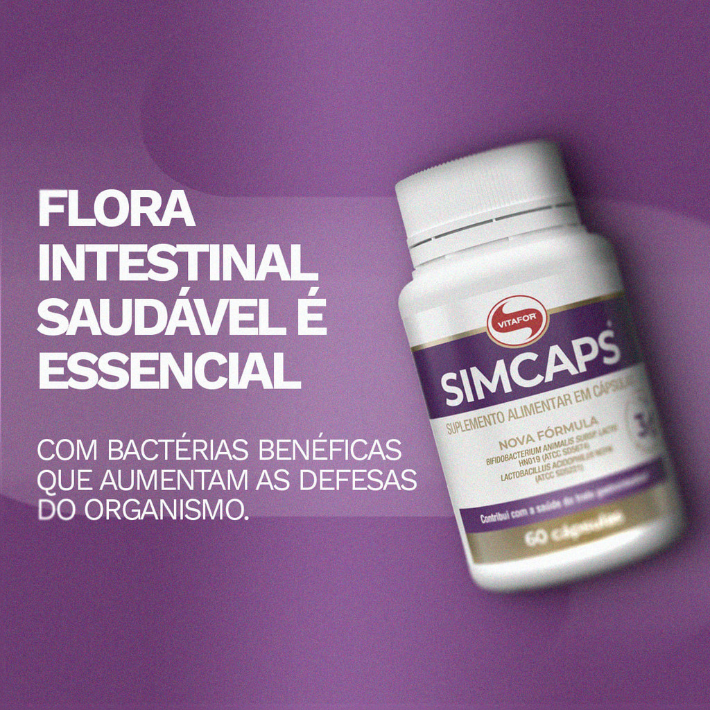 Loja Fit & Beauty - Cuidando da Saúde e do Bem Estar Uma flora intestinal saudável é essencial para a saúde, afinal o bom funcionamento do intestino influência em toda a absorção de nutrientes e no organismo. Sua imunidade, seu humor e até a parte digestiva, podem ser afetados se você não se atentar, por isso os probióticos tem um papel importante nesse processo, pois são bactérias benéficas que auxiliam e aumentam as defesas, prevenindo o desenvolvimento de doenças infecciosas, inflamatórias, úlceras e até alergias. Não deixe de cuidar da sua saúde, inclua Simcaps na sua rotina, um mix de probióticos em cápsulas, com Lactobacillus acidophilus e Bifidobacterum lactis que contribuem para o equilibro da flora intestinal. Tenha mais qualidade de vida! BENEFÍCIOS: - Previne alergias - Trata diarreias - Combate a cistite - Eficaz contra úlceras e inflamações no intestino - Auxilia no sistema imunológico - Auxilia a reduzir o colesterol - Reduz infecções virais - Melhora a saúde do tubo digestivo - Auxilia na resistência à insulina - Auxilia na prevenção e tratamento de doenças respiratórias - Suplemento alimentar em cápsulas - 3 bilhões de microrganismos por porção - Cápsula gastrorresistente - Composto por lactobacilos e bifidobactérias --mais amplitude de atuação no TGI (tratogastrointestinal) - Não contém glúten SUGESTÃO DE USO: Consumir 2 cápsulas ao dia. O consumo deve ser acompanhado da ingestão de líquidos.