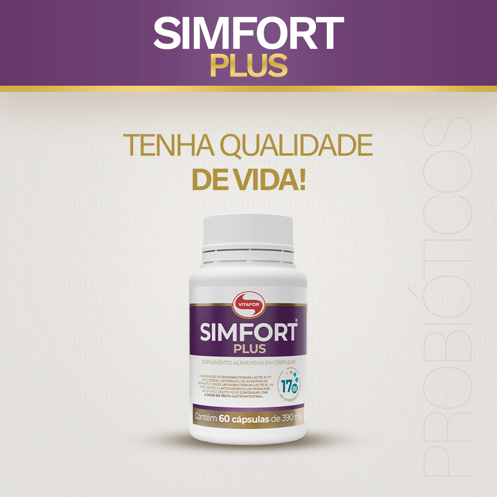 Uma flora intestinal saudável é essencial para a saúde, afinal o bom funcionamento do intestino influência em toda a absorção de nutrientes e no organismo. Sua imunidade, seu humor e até a parte digestiva, podem ser afetados se você não se atentar, por isso os probióticos tem um papel importante nesse processo, pois são bactérias benéficas que auxiliam e aumentam as defesas, prevenindo o desenvolvimento de doenças infecciosas, inflamatórias, úlceras e até alergias. Não deixe de cuidar da sua saúde, inclua Simfort Plus na sua rotina, com 17 bilhões de probióticos ativos e resistentes ao PH do estômago, que contribuem para o equilibro da flora intestinal. Tenha mais qualidade de vida! - 8,5 bilhões de microrganismos por cápsula; - 17 bilhões de microrganismos por porção. - Vegano; - Resistente ao ph do estômago; - Não contém glúten; - Praticidade no formato cápsulas. INGREDIENTES Lactobacillus acidophilus (NCFM), Bifidobacterium Lactis (BI-07), Lacticaseibacillus paracasei (LPC-37), Bifidobacterium Lactis (BL-04), agente de massa celulose microcristalina, antiumectante dióxido de silício e lubrificante estearato de magnésio. Composição da cápsula: Hidroxipropilmetilcelulose (HPMC), água purificada, gelificante goma gelana, estabilizante pectina e corante dióxido de titânio. SUGESTÃO DE USO Suplemento alimentar de uso adulto a partir de 19 anos de idade. ingerir 0,78 g (2 cápsulas) ao dia ou seguir a recomendação de um profissional da saúde.