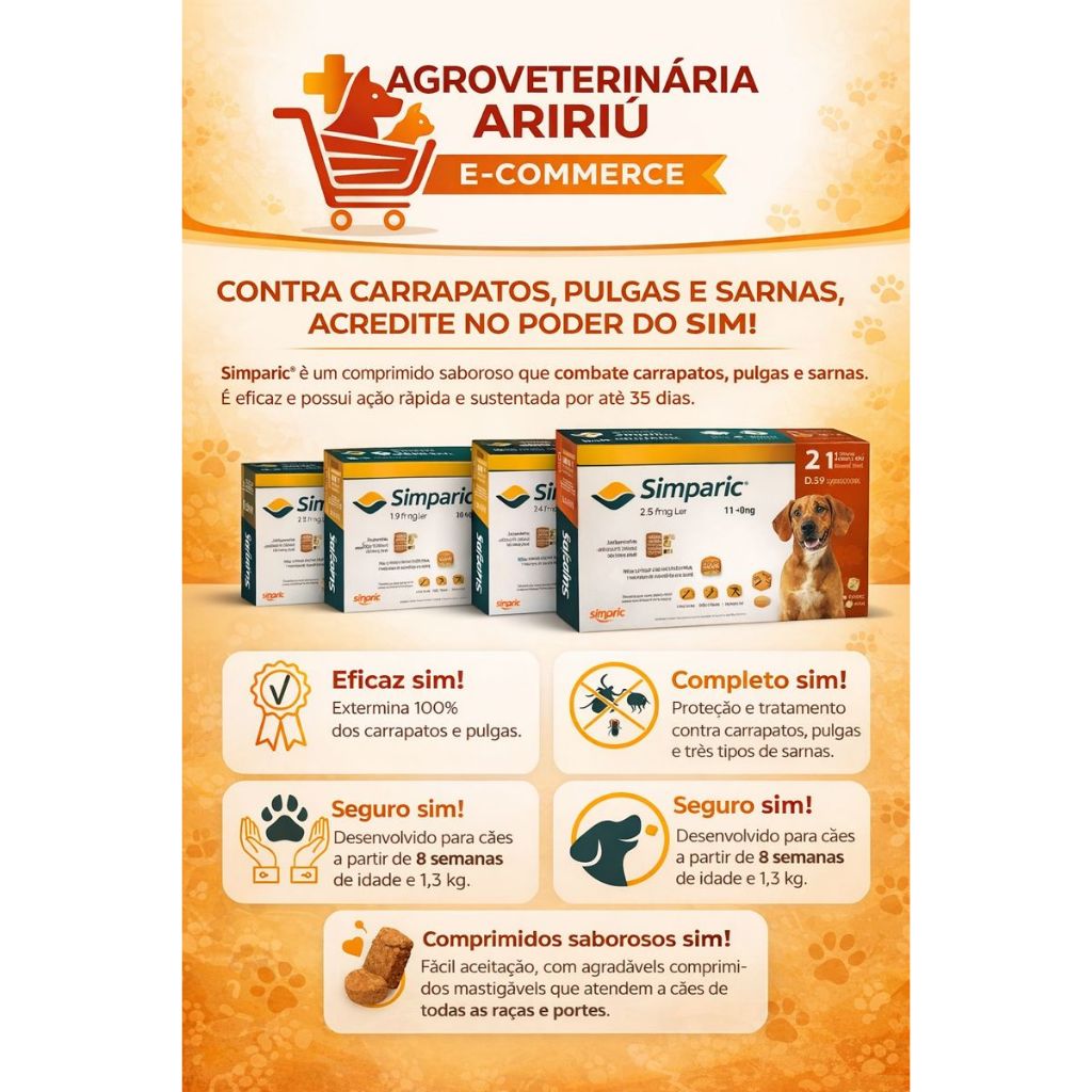 🐶 Simparic 40mg para Cães de 10,1 a 20kg – 1 Comprimido Sarolaner | Proteção Mensal contra Pulgas, Carrapatos e Sarnas | Zoetis O Simparic® 40mg da Zoetis é um antiparasitário oral indicado para cães com peso entre 10,1 e 20 kg, proporcionando proteção eficaz contra pulgas, carrapatos e sarnas por até 35 dias com apenas um comprimido mastigável. Prático, seguro e altamente palatável, facilita a administração e garante proteção prolongada para o seu pet. 🛡️ Proteção contra: ✔️ Pulgas ✔️ Carrapatos ✔️ Sarnas (incluindo sarna sarcóptica) ⭐ Benefícios ✔️ Ação rápida ✔️ Proteção por até 35 dias ✔️ Comprimido mastigável altamente palatável ✔️ Fácil de administrar ✔️ Produto original Zoetis ✔️ Segurança e eficácia comprovadas 🐾 Indicação Cães de 10,1 a 20 kg Uso exclusivamente veterinário Administrar conforme orientação do médico-veterinário 💊 Composição 40 mg de Sarolaner 📦 Conteúdo da Embalagem 1 blister com 1 comprimido mastigável ⚠️ Informações Importantes Produto de uso veterinário Não administrar em gatos Manter fora do alcance de crianças 🐾 Garanta proteção mensal contra os principais parasitas externos com a qualidade e confiança da Zoetis. Simparic® é praticidade, segurança e proteção em dose única mensal!