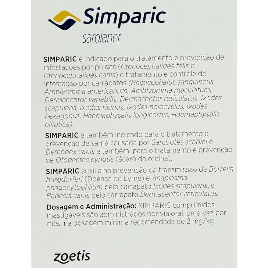 Simparic Antipulgas e Carrapatos Caes 10,1 A 20Kg O Simparic e um comprimido mastigavel altamente palatavel de protecao contra pulgas, carrapatos e sarnas indicado para caes e filhotes. Apos a ingestao do medicamento, sua acao dura por, pelo menos, 5 semanas. Este medicamento tambem pode ser usado como estrategia de tratamento para controle de dermatite alergica por picada de pulga. Para o tratamento de infestacoes de pulgas, o Simparic deve ser administrado uma vez por mes a epoca de pulgas , para o tratamento de sarnas, o Simparic deve ser administrado uma vez por mes, durante dois meses consecutivos. O Simparic possui substancia ativa que, uma vez que o parasita se alimenta do sangue do cao, sao expostos a mesma e morrem antes que possam produzir ovos, contribuindo na reducao de contaminacao no ambiente em que os caes vivem. Com este medicamento, os caes podem tomar banho sem risco de diminuir sua eficacia. A seguir a formula do Simparic, de acordo com a bula Cada 1g do produto contem: Sarolaner............ 40 mg Excipiente q.s.p...... 1,0g Informacoes complementares - Simparic e indicado APENAS para cachorros. - Tem protecao garantida por 35 dias. - O Simparic pode ser administrado em caes de pequeno, medio e grande porte de acordo com o seu peso corporeo. - E mais eficaz que as pipetas, porque funciona de dentro para fora, e protege o seu cao das carracas e pulgas ate 5 semanas. - Nao administrar em caso de hipersensibilidade por parte do animal a substancia ativa ou a algum dos excipientes - Se a sua cadela estiver gravida aconselhe-se com o medico veterinario antes de administrar este medicamento veterinario.