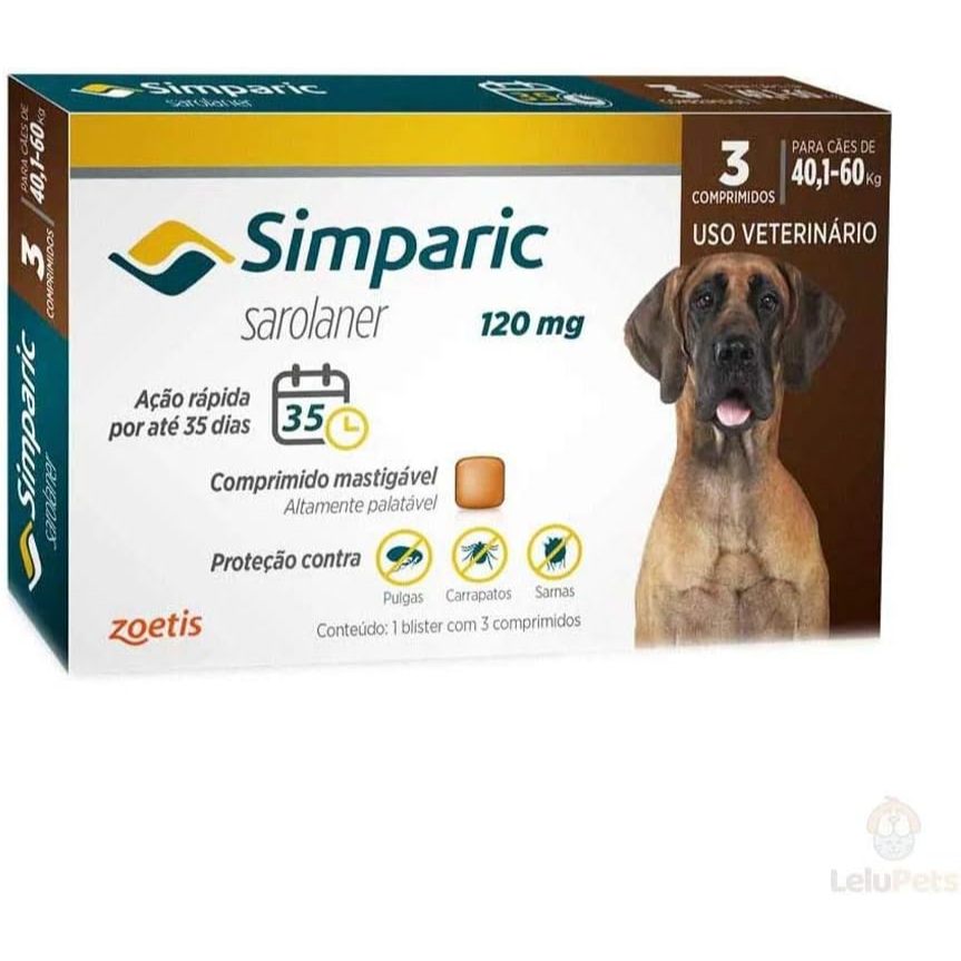 Simparic Antipulgas e Carrapatos Caes 40,1 a 60kg c/3 Comprimidos O Simparic e um comprimido mastigavel altamente palatavel de protecao contra pulgas, carrapatos e sarnas indicado para caes e filhotes. Apos a ingestao do medicamento, sua acao dura por, pelo menos, 5 semanas. Este medicamento tambem pode ser usado como estrategia de tratamento para controle de dermatite alergica por picada de pulga. Para o tratamento de infestacoes de pulgas, o Simparic deve ser administrado uma vez por mes a epoca de pulgas; para o tratamento de sarnas, o Simparic deve ser administrado uma vez por mes, durante dois meses consecutivos. O Simparic possui substancia ativa que, uma vez que o parasita se alimenta do sangue do cao, sao expostos a mesma e morrem antes que possam produzir ovos, contribuindo na reducao de contaminacao no ambiente em que os caes vivem. Com este medicamento, os caes podem tomar banho sem risco de diminuir sua eficacia. Dicas Importante lembrar que Simparic e indicado apenas para cachorros. Pode ser administrado em caes de pequeno, medio ou grande porte de acordo com seu peso corporeo. Sua formula faz com que sua eficacia seja melhor que as pipetas, pois funciona de dentro para fora, protegendo o seu cao das carracas e pulgas ate 5 semanas. O medicamento e contra indicado em casos de hipersensibilidade por parte do animal a substancia ativa ou a algum dos excipientes. Sempre leia a bula e procure um medico veterinario de sua confianca!!! A seguir a formula do Simparic, de acordo com a bula: Cada 1g do produto contem: Sarolaner............ 40 mg Excipiente q.s.p...... 1,0g