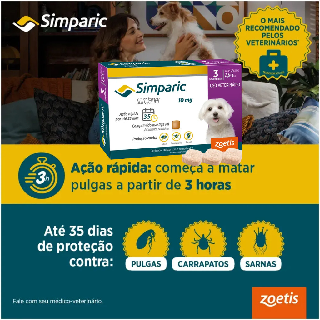 PROMOÇÃO DEVIDO VALIDADE PARA 30.ABRIL.2026 Antipulgas Simparic 10mg para Cães 2,6 a 5kg 3 comprimidos - Elimina 100% de pulgas e carrapatos; - Comprimido mastigável e altamente palatável; - Combate também três tipos de sarnas; - Indicado para cães a partir de 8 semanas de idade; - Começa a fazer efeito em 3 horas e protege por até 35 dias. - PRODUTO ORIGINAL O Simparic 10mg é um eficiente antipulgas, carrapatos e sarnas de ação rápida que protege o seu cão por até 35 dias. Seus comprimidos mastigáveis e palatáveis ajudam na deglutição do medicamento pelo animal. Simparic 10mg: para que serve? O antipulgas e carrapatos Simparic 10mg é indicado para o tratamento e prevenção de animais de raças minis contra infestação parasitária. Sua administração é recomendada para cães filhotes, adultos e sênior com peso entre 2,6 e 5kg. Simparic 10mg: composição básica Cada 1g do antipulgas Simparic 10mg contém: Sarolaner: 40mg; Excipiente q.s.p.: 1g. Simparic 10mg: modo de usar De acordo com a Zoetis, fabricante do medicamento para cachorros de porte mini, o antipulgas Simparic 10mg deve ser administrado da seguinte maneira: um comprimido por mês com a dosagem mínima de 2mg/kg. Para maiores informações sobre o tratamento de infestação de pulgas e carrapatos, consulte a bula do Simparic 10mg. Não se esqueça de seguir a orientação de um médico-veterinário de confiança. Simparic 10mg: contraindicação Não há restrições para a administração do Simparic em cães. Entretanto, o laboratório fabricante alerta que o medicamento não foi avaliado em cadelas prenhas ou lactantes. Lembre de lavar as mãos após oferecer os comprimidos ao seu animal de estimação. Simparic 10mg: efeitos colaterais A prevenção e o tratamento contra pulgas e carrapatos com o Simparic 10mg pode apresentar alguns efeitos colaterais. São eles: Vômito; Diarreia; Letargia; Perda de apetite. O Simparic começa a agir em quanto tempo? De acordo com o fabricante, o Simparic, com sarolaner em sua composição, começa a apresentar efeitos positivos em até 3 horas após a administração e mantém-se a eficácia por até 35 dias. Além do efeito prolongado, o antipulgas oferece outras vantagens. Com o tratamento, o ambiente onde o cão vive também fica protegido, uma vez que o medicamento impede a colocação de novos ovos no ambiente. O Simparic 10mg é indicado para filhotes? O antipulgas Simparic 10mg é recomendado para cães de pequeno porte a partir de oito semanas de idade. Certifique-se de escolher o medicamento de acordo com o peso corpóreo ideal. Em caso de dúvidas, consulte o médico-veterinário de confiança. Simparic 10mg: dicas de conservação O Simparic 10mg é um antipulgas e carrapatos com prazo de validade de 24 meses após a fabricação. Para conservar melhor o medicamento, é recomendado armazenar a embalagem em local seco, arejado e protegido do sol. Deixe o produto longe do alcance de crianças e animais de estimação. Simparic tem a qualidade Zoetis O antipulgas e carrapatos Simparic é um medicamento com o selo de qualidade Zoetis, uma das líderes do mercado de saúde animal e presente em mais de 120 países. Com mais de 65 anos de história, o laboratório atua em todas etapas para garantir a saúde e o bem-estar dos animais. Ficha técnica Idade Filhote, Adulto, Sênior Marca Simparic Indicação Proteção contra pulgas, carrapatos e sarnas Tempo de Proteção Até 35 dias Composição Sarolaner Tipo de Pet Cachorros