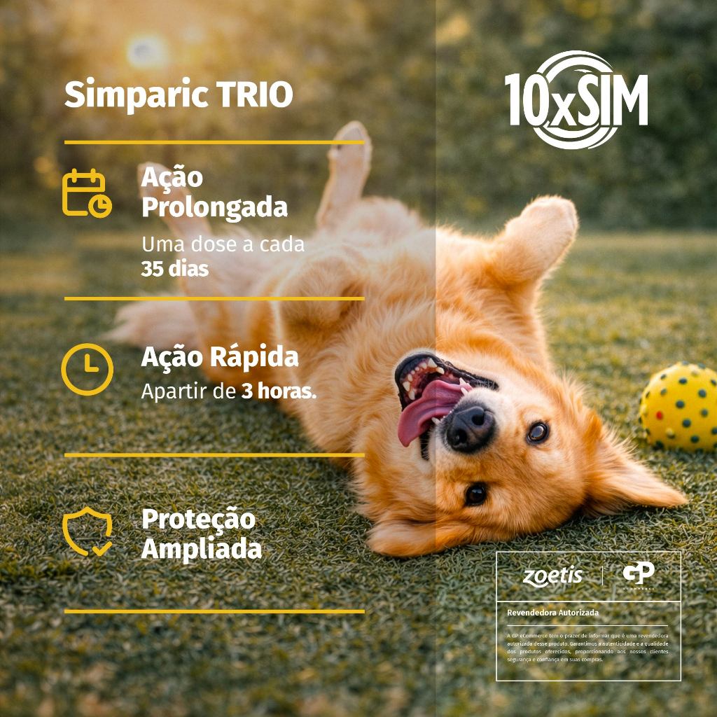 PRODUTO ORIGINAL COM NOTA FISCAL! - - - - - APRESENTAÇÃO: 1 x Simparic Trio 48Mg 20,1 a 40Kg 3Cp - - - - - - - - - - DESCRIÇÃO: Simparic TRIO® é um comprimido mastigável saboroso, desenvolvido para proteger seu cão de forma prática e segura. Com três ingredientes ativos, ele age rapidamente contra pulgas, carrapatos e vermes, incluindo os vermes intestinais, do coração e pulmonar. Uma única dose oferece proteção ampliada por até 35 dias, trazendo mais saúde e tranquilidade para você e seu melhor amigo. Simparic TRIO® é um comprimido mastigável saboroso com ação contra pulgas, carrapatos, vermes intestinais, verme do coração e verme pulmonar com ação rápida e sustentada por até 35 dias. O primeiro antipulgas oral aprovado também para prevenção do verme do coração e do verme pulmonar! - - - - - MODO DE USO: Uso oral. Comprimido mastigável, sendo altamente palatável, podendo ser administrado com ou sem alimentos. - - - - - - - - - - Enviamos o seu pedido o quanto antes possível! Agradecemos a preferência.