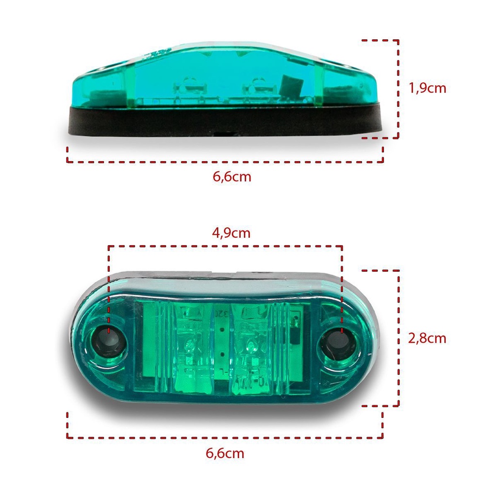 TP-6309 - LANTERNA DELIMITADORA 2 LEDs BIVOLT VERDE CARACTERÍSTICAS • Dimensões do produto LxAxC: 6,6x1,9x2,8cm • Comprimento do chicote: 24cm • Distância entre furos para instalação: 4,9cm • Bivolt • Alto brilho • Alta durabilidade • Resistente a água • Distribuição uniforme da iluminação • Fácil de adaptar • Baixo consumo de energia • Aplicação: Caminhão baú, trailer, barcos, carretas, ônibus, vans etc. Tudo o que você sempre buscou em benefícios, vai encontrar no LANTERNA DELIMITADORA 2 LEDs BIVOLT Verde! A LANTERNA DELIMITADORA 2 LEDs é feita de um material de alta qualidade que oferece maior durabilidade, tamanho compacto e acabamento impecável. Além de ser resistente a vibrações e calor, possui grau de proteção IP 65 resistente a água. Usada na lateral dianteira e parte superior do baú, tendo como principal função indicar as dimensões laterais dos veículos, tais como caminhões baú, trailer, barcos, carretas e ônibus facilitando a visibilidade à noite. A sua Lente é em PMMA anti-UV, com design ótico avançado, e a base é feita de ABS anti-UV. Seu circuito eletrônico com proteção de ligação invertido evitará que seus LEDs queimem. O produto não acompanha suporte. A LANTERNA DELIMITADORA 2 LEDs BIVOLT Verde oferece alta qualidade, durabilidade, segurança, resistência e excelente luminosidade! ESQUEMA DE LIGAÇÃO ELÉTRICA • Fio laranja = positivo. • Fio preto = negativo (GND, TERRA). ESPECIFICAÇÕES • Cor: Verde • Encaixe: Universal • Tensão: 12 a 24V • Equivalência: 3W • Lente: PMMA anti-UV • Tipo de LED: SMD • Linha: Standart • Grau de proteção de água: IP65 • Fluxo Luminoso: 5 lúmens ITENS INCLUSOS • 1 TP-6309 - LANTERNA DELIMITADORA 2 LEDs Bivolt Verde