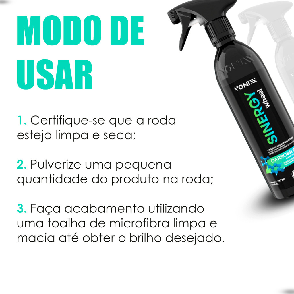 >>>>>>SINERGY WHEEL COATING SPRAY PARA RODAS 500ML VONIXX<<<<<< Conteúdo da Embalagem: 01 (Um) Coating Spray para Rodas; Sinergy Wheel 500ml Vonixx; **Imagens e vídeo do anúncio são reais. Sinergy Wheel Spray Coating foi desenvolvido para proteger e dar brilho em rodas com proteção de até 6 meses. O produto traz a nanotecnologia exclusiva da Vonixx, carbosiloxy, onde o elemento químico carbono age em sinergia com o silício para formar um filme resistente e super hidrofóbico. Um dos diferenciais desse produto é o tamanho da cadeia carbônica, que, por ser mais longa, promove resistência superior às altas temperaturas que passam da frenagem para a roda. CARBOSILOXY é uma tecnologia exclusiva da Vonixx onde o carbono age em sinergia com o silício para formar um filme hidrofóbico e resistente, esse processo de adição do filme de silício através do carbono, denominamos de SILITIZAÇÃO. INFORMAÇÕES ADICIONAIS: Não recomendamos o uso do produto em pinturas (lataria), pois pode ocasionar manchas. BENEFÍCIOS: SUPER PODER HIDROFÓBICO PROTEÇÃO DE ATÉ 6 MESES RESISTÊNCIA A ALTAS TEMPERATURAS MODO DE USAR: 1- Certifique-se que a roda esteja limpa e seca; 2- Pulverize uma pequena quantidade do produto na roda; 3- Faça acabamento utilizando uma toalha de microfibra limpa e macia até obter o brilho desejado.