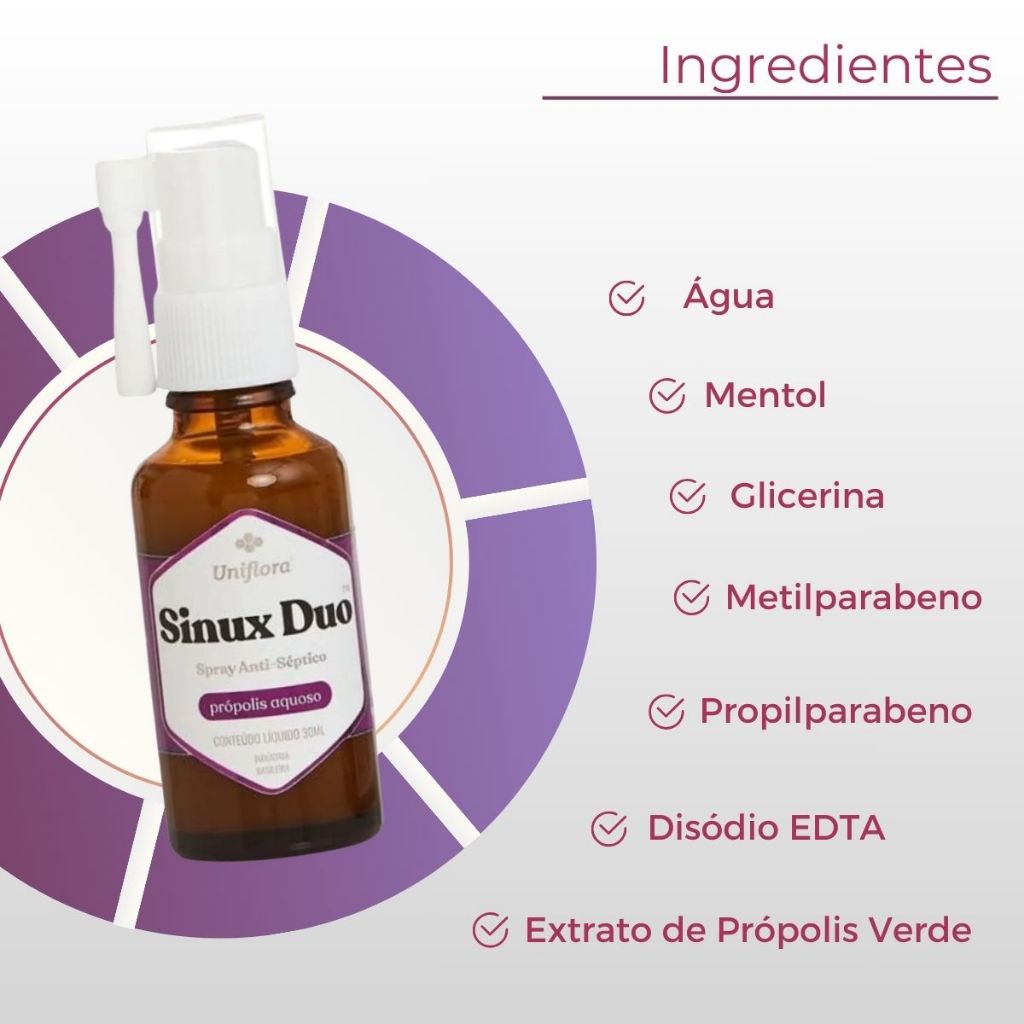 | Sinux Duo Spray Nasal Com Própolis Verde 30ml - Uniflora este produto | R$ 36,58 | — | 4.9/5 | 6 |