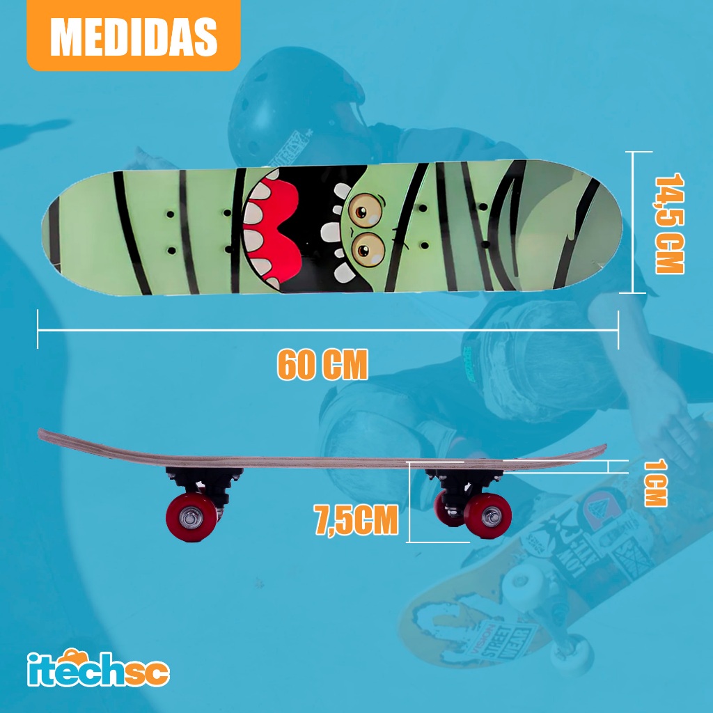 Bem-vindo à ITECH SC! É um prazer recebê-lo em nossa loja! Temos orgulho de servir clientes em todo o Brasil. Sinta-se à vontade para entrar em contato com nossa equipe e descobrir tudo que temos a oferecer. Agradecemos por escolher a ITECH SC e esperamos que você tenha uma excelente experiência de compra conosco! ----------------------------------------------------------------------------------------------------------------------- Apresentamos o Skate Infantil Semi Profissional. Diversão e estilo garantidos! Este skate é perfeito para iniciantes ou praticantes que desejam aperfeiçoar suas habilidades. Com design moderno e estrutura resistente, ele oferece segurança e performance para crianças e adolescentes. ----------------------------------------------------------------------------------------------------------------------- Alta Qualidade: Desenvolvido com padrão semi profissional, ideal para iniciantes e praticantes. Segurança: Shape com camadas prensadas. Conforto e Durabilidade: Rodas em poliuretano macio, amortecedores em PVC para absorção de impactos e resistência. Qualidade: Semi profissional Idade Indicada: A partir de 3 anos Capacidade: Suporta até 45kg Estrutura: Reforçada para alta durabilidade Dimensões: 60cm (comprimento) x 14,5cm (largura) Materiais: Madeira, poliuretano e metal Conteúdo: 01 Skate montado (Não acompanha acessórios) ----------------------------------------------------------------------------------------------------------------------- Quais são os benefícios do skate para crianças? Promove diversão, desenvolvimento motor, equilíbrio e interação social. Também é inclusivo, já que permite que crianças convivam com skatistas mais experientes e se inspirem neles. Qual é a diferença entre um skate infantil e um profissional? Skates infantis são menores, mais leves e projetados para facilitar o aprendizado. Eles costumam ter rodas mais macias e um design adaptado para maior estabilidade. Como garantir maior durabilidade para o skate? Evite expor o skate à água, verifique regularmente os parafusos e os rolamentos e use o skate em superfícies lisas e planas. Qual é a diferença entre rodas macias e duras? Rodas macias absorvem mais impacto, proporcionando maior conforto. Rodas duras possuem melhor desempenho para manobras em superfícies lisas, mas transmitem mais vibração. ----------------------------------------------------------------------------------------------------------------------- Desperte a paixão pelo skate! Adquira já o Skate Infantil e proporcione momentos incríveis de diversão e aprendizado para o seu pequeno(a). ----------------------------------------------------------------------------------------------------------------------- Skate para crianças e adolescentes Skate semi profissional reforçado Skate com rodas de poliuretano Presente ideal para jovens esportistas Skate com estampas modernas Skate de alta durabilidade Skate leve e estiloso