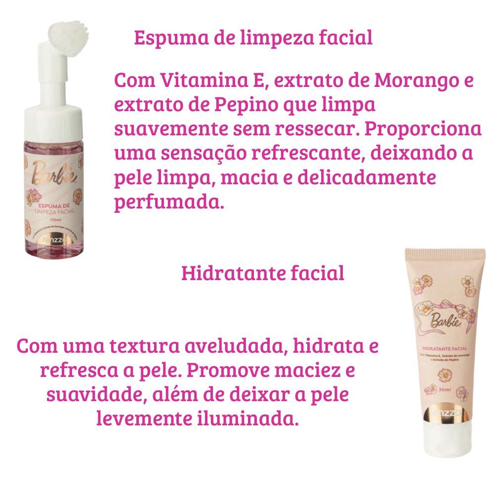 Kit Skincare Barbie – Transforme o momento de cuidado em uma experiência divertida e encantadora! ✨ O Kit Skincare Barbie foi pensado para trazer hidratação, limpeza e um cheirinho delicioso, tudo com um visual lindo que as crianças adoram 💕 O que vem no kit: Creme para as mãos Body Splash Espuma de limpeza facial Sérum facial Hidratante facial Benefícios: Hidrata e deixa a pele macia Limpeza suave sem ressecar Fragrância leve e agradável Texturas leves e de rápida absorção Ideal para uso diário