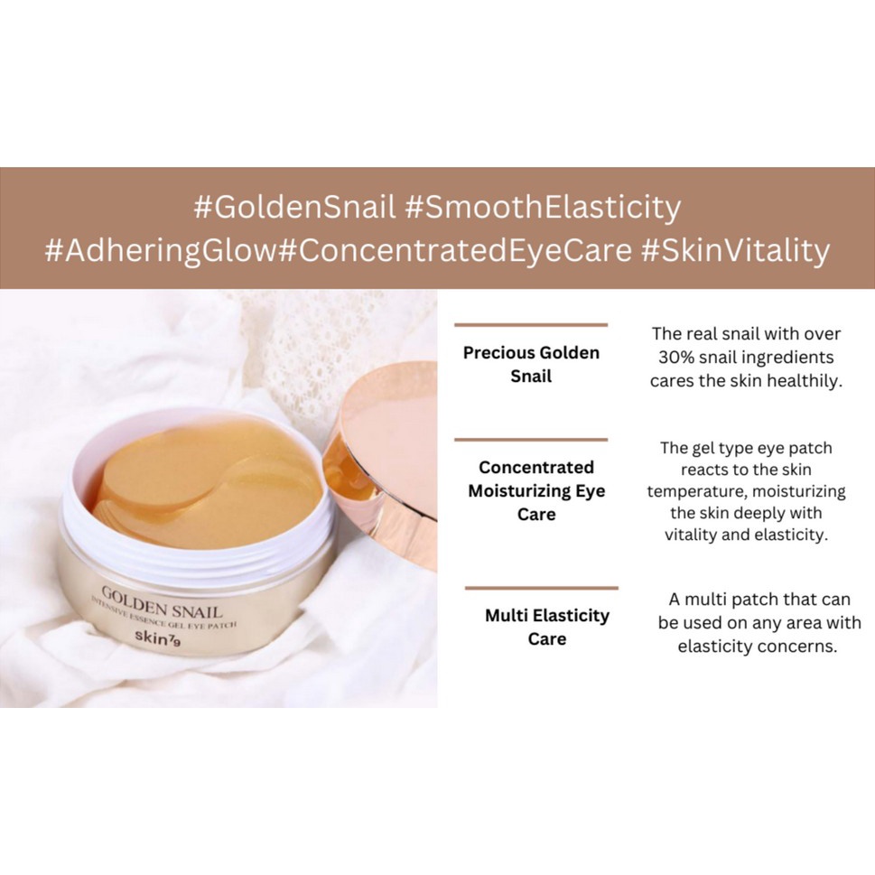 Descrição do produto em inglês após português - Remendo de olhos de Gel intensivo de caracol dourado SKIN79 - 60 EA - Um remendo de olhos vitalizante e Anti-envelhecimento com apenas os ingredientes mais preciosos. Caracol dourado precioso - O caracol real com mais de 30% de ingredientes de caracol cuida da pele de forma saudável - O caracol real com mais de 30% de ingredientes de caracol cuida da pele de forma saudável. Cuidados com os olhos hidratantes concentrados - O remendo de olho tipo gel reage à temperatura da pele, hidratando profundamente a pele com vitalidade e elasticidade. Cuidados com A multi Elasticidade - Um multi remendo que pode ser usado em qualquer área com preocupações de elasticidade - Um multi remendo que pode ser usado em qualquer área com preocupações de elasticidade. Remendo de olhos hidratante e nutritivo para os olhos lisos.O remendo de olho de hidrogel adere firmemente à pele, transmitindo os ingredientes e tenda a pele com umidade e elasticidade. ************************************************** - SKIN79 Golden Snail Intensive Gel Eye Patch - 60 EA - A Vitalizing and Anti-Aging Eye Patch With Only The Most Precious Ingredients. - Precious Golden Snail - The real snail with over 30% snail ingredients cares the skin healthily. - Concentrated Moisturizing Eye Care - The gel type eye patch reacts to the skin temperature, moisturizing the skin deeply with vitality and elasticity. - Multi Elasticity Care - A multi patch that can be used on any area with elasticity concerns. - A Moisturizing and Nourishing Eye Patch For Smooth Eyes. - The hydrogel eye patch adheres tightly to the skin, conveying the ingredients and tending the skin with moisture and elasticity.