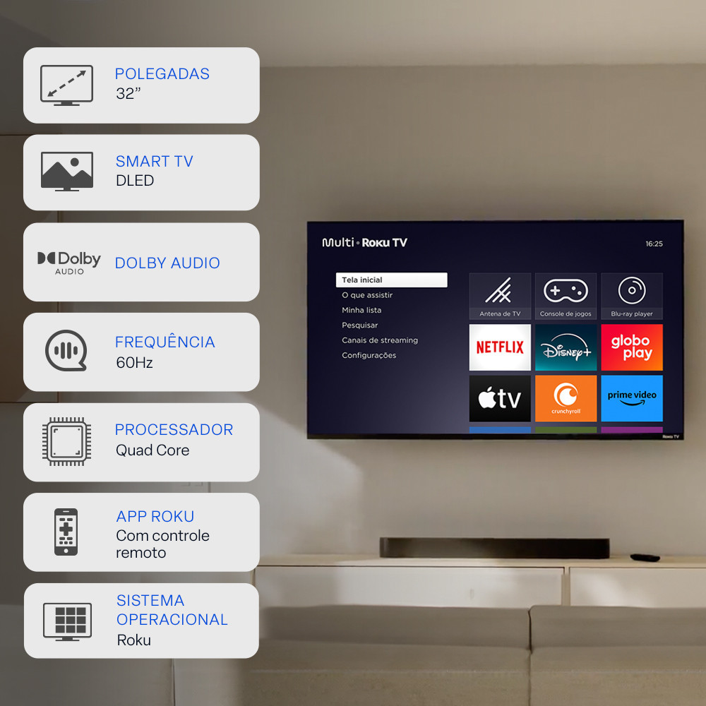 Smart TV DLED 32 HD Multi Essencial Roku 3HDMI 2USB Wi-Fi - TL081E Roku - Sistema completo para o seu entretenimento A Multi Essencial Roku TV é inteligente o suficiente para reunir seus apps de streaming favoritos, diversas entradas e qualidade de imagem em um só lugar. Acesse Netflix, Disney+, Apple TV, MAX, Prime Vídeo, Sky+, Pluto TV, Globoplay, Paramount+, Mubi e muito mais*. *Assinaturas não incluídas. Espelhe a tela do seu smartphone Android ou iOS diretamente na televisão para curtir qualquer conteúdo. Fones de ouvido - Conecte fones de ouvido à TV Ative o Modo Fones de Ouvido pelo aplicativo Roku, conecte pelo smartphone e assista a sua programação com fones de ouvido. Controle a smart TV pelo controle remoto ou celular. Botões de acesso rápido Pressione os botões de acesso rápido no controle remoto para acessar a Netflix, Apple TV, Prime Vídeo ou Globoplay com facilidade. Use o app gratuito Roku no seu smartphone para controlar também a TV: tudo com apenas alguns toques ou por comando de voz. A Smart TV 32 HD Multi Essencial Roku TV é compatível com Alexa, Siri e Google Home. A tela DLED da Smart TV 32 HD Multi Essencial Roku TV tem definição HD para melhorar ainda mais a sua experiência. Definição de áudio: Aproveite o áudio da TV nas suas séries e filmes favoritos com o padrão de qualidade Dolby. Ficha técnica Marca: Multi Modelo: Smart TV DLED 32 HD Multi Essencial Roku 3HDMI 2USB Wi-Fi - TL081E Linha: Essencial Cor: Preto Sistema Operacional: Roku Tamanho da Tela: 32 polegadas HD Tecnologia: DLED Smart: Sim Processador: Quad Core Ângulo de visão: H: 178° V: 178° Contraste: 2000:1 Brilho (cd/m²): 180 HDR: SIM Bluetooth: Não Consumo médio: 36W Entradas: 3xHDMI; 1xAV; 2xUSB; 1xÓptica; 1xLAN Ethernet Dimensões do produto (LxAxC): 80x47x12 cm Peso do produto: 3,7 kg Inmetro: 002256/2022 Certificado Anatel: 13889-21-06714 Garantia dos acessórios: 3 meses Garantia: 1 Ano *Imagens meramente ilustrativas.
