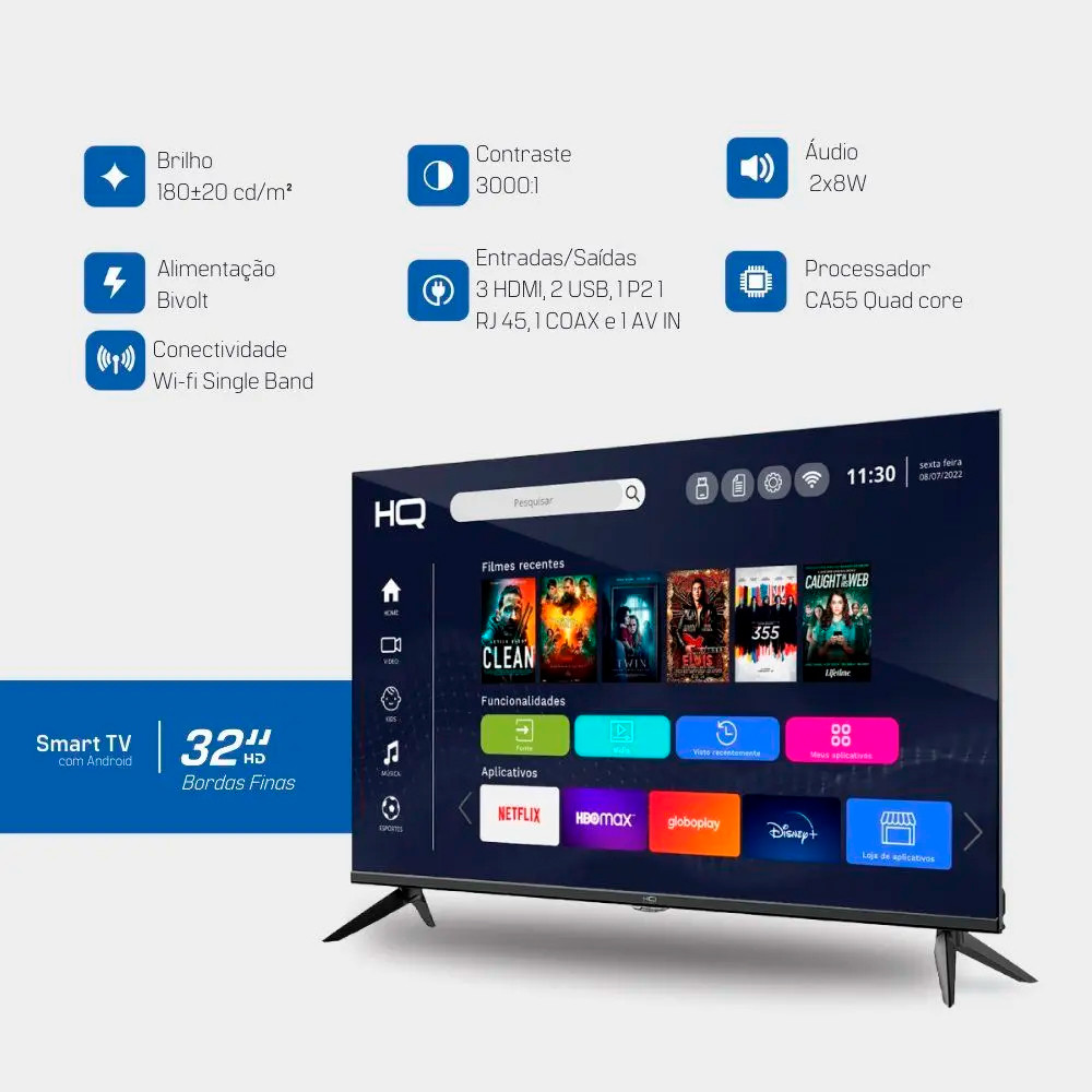 A Smart TV HQ 32" HD Slim HQS32NKHM oferece qualidade de imagem em alta definição com design moderno, tela sem bordas e sistema Android. Ideal para ambientes compactos, entrega desempenho eficiente, conectividade completa e acesso rápido a seus aplicativos favoritos como YouTube, Netflix e Prime Video. Compacta e funcional, é perfeita para o dia a dia. CARACTERÍSTICAS PRINCIPAIS Resolução HD para imagens nítidas e brilhantes Tela de 32" com design slim e sem bordas Sistema Android com diversos aplicativos Processador quad-core e GPU Mali para uso fluido Áudio potente com 2 alto-falantes de 8W RMS Conexões HDMI, USB, P2, AV, RF e saída óptica Espelhamento de tela e navegador integrado ESPECIFICAÇÕES TÉCNICAS Tamanho da tela: 32" LED Resolução: 1366 x 768 (HD) Sistema operacional: Android 11 ou 12 (varia por lote) Processador: Quad-core CA55 GPU: Mali 450 ou G31MP2 Memória RAM: 1 GB Armazenamento interno: 8 GB Conectividade: Wi-Fi integrado (2.4 GHz), LAN RJ45 Entradas: 3 HDMI, 2 USB, AV, RF, saída óptica, entrada P2 para fone Recursos adicionais: Espelhamento de tela, navegador, gravação via USB, closed caption, congelamento de imagem, timer Áudio: 2 x 8W RMS com som estéreo e efeito surround Conversor digital integrado Eficiência energética: Consumo < 50W (uso normal), < 0,5W (standby) Fonte de alimentação: Bivolt automático Homologação Anatel: Sim GARANTIA 12 meses (3 meses de garantia legal + 9 meses contra defeitos de fabricação) DIMENSÕES E PESO DO PRODUTO (SEM EMBALAGEM) Altura: 46,9 cm Largura: 71,6 cm Profundidade com base: 20,9 cm Peso: 3,4 kg DIMENSÕES E PESO DO PRODUTO (COM EMBALAGEM) Altura: 52 cm Largura: 79 cm Profundidade: 25 cm Peso: 4,5 kg