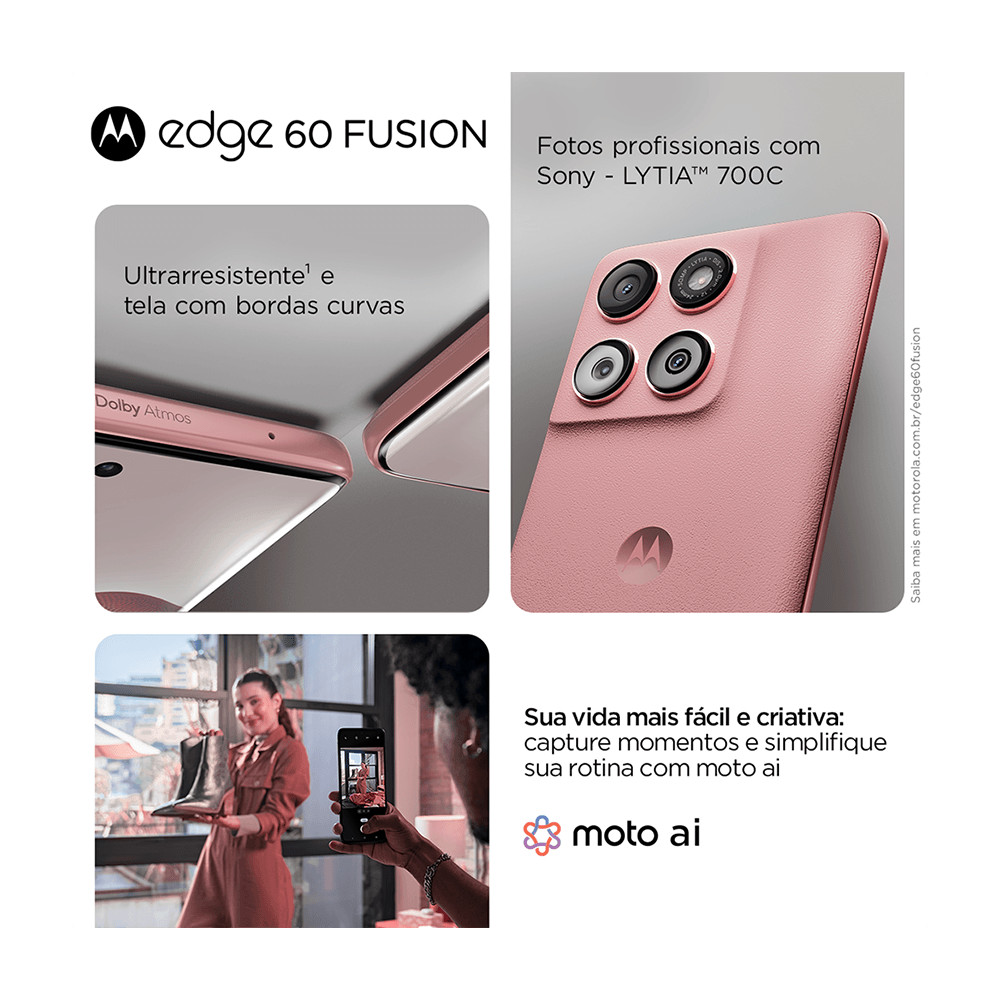 Descubra o Motorola Edge 60 Fusion 5G, um smartphone que combina desempenho excepcional e design elegante. Com uma tela pOLED de 6,7 polegadas e resolução Super HD de 1220x2712, cada imagem ganha vida com cores vibrantes e detalhes nítidos. O processador de 2,5 GHz e 8 GB de RAM, com um impulso adicional de 8 GB, garantem uma experiência fluida, ideal para jogos e multitarefas. Capture momentos inesquecíveis com a câmera principal de 50 MP, equipada com tecnologia Sony AI, que proporciona fotos impressionantes em qualquer condição de iluminação. A câmera frontal de 32 MP e a lente ultra angular de 13 MP ampliam suas possibilidades criativas, permitindo selfies e paisagens deslumbrantes. Com recursos como estabilização inteligente e visão noturna, suas fotos sempre terão qualidade profissional. A bateria de 5200 mAh garante que você permaneça conectado por mais tempo, enquanto a resistência à água e poeira (IP68) e a certificação MIL-STD 810H oferecem durabilidade em qualquer situação. O Motorola Edge 60 Fusion também é compatível com 5G, permitindo que você aproveite velocidades de internet ultrarrápidas e conectividade sem interrupções. Com recursos adicionais como reconhecimento facial, leitor de impressão digital e carregamento rápido via USB-C, este smartphone é a escolha perfeita para quem busca tecnologia de ponta e praticidade no dia a dia. Experimente a inovação e a qualidade que só a Motorola pode oferecer.