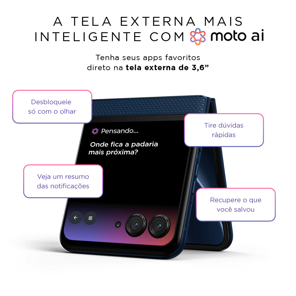 O Motorola Razr 60 5G reinventa o conceito de smartphone dobrável com um design icônico que chama atenção desde o primeiro olhar. Com tela principal pOLED de 6,9" e uma tela externa de 3,6", você tem uma experiência visual completa — seja navegando em apps, assistindo vídeos ou conferindo notificações sem abrir o aparelho. Equipado com o poderoso processador MediaTek Dimensity 7400X, o Razr 60 entrega performance fluida no Android 15 para suas atividades diárias, multitarefa e aplicativos mais exigentes. Com 24 GB de memória RAM (12 GB + 12 GB RAM Boost) e 256 GB de armazenamento interno, você terá espaço e velocidade para tudo o que precisa — jogos, fotos, vídeos e muito mais. Registre seus melhores momentos com a câmera traseira principal de 50 MP com estabilização ótica e uma lente ultrawide para fotos amplas e criativas. A câmera frontal de 32 MP garante selfies nítidas e cheias de detalhes, perfeita para redes sociais ou videochamadas em alta qualidade. Com uma bateria de 4.500 mAh e carregamento rápido TurboPower, você não precisa se preocupar com a autonomia ao longo do dia — assista, jogue, trabalhe e conecte-se sem interrupções. E com 5G, Wi-Fi 6 e NFC integrados, o Razr 60 oferece conectividade moderna para qualquer situação. Além do visual sofisticado, o Motorola Razr 60 apresenta construção resistente com materiais de alta qualidade e certificação IP48 de proteção contra poeira e água, combinado com alto-falantes estéreo Dolby Atmos para som imersivo.