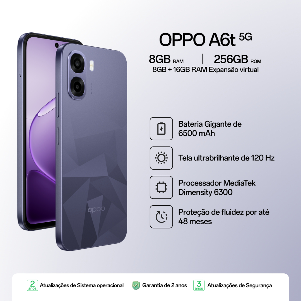 Descubra o Smartphone Oppo A6T 5G, uma combinação perfeita de desempenho e estilo. Com 256GB de armazenamento interno e 8GB de RAM, este dispositivo é ideal para quem busca agilidade e espaço para todos os seus aplicativos e arquivos. Seu design elegante na cor violeta se destaca, tornando-o não apenas funcional, mas também uma extensão do seu estilo pessoal. A tela de 6,75 polegadas com resolução de 570 px × 720 px proporciona uma experiência visual imersiva, perfeita para assistir a vídeos ou jogar. A câmera traseira de 50 Mpx, com recursos de grande-angular e macro, permite capturar imagens impressionantes, enquanto a câmera frontal de 5 Mpx garante selfies de qualidade. Com uma bateria robusta de 6500 mAh, você pode desfrutar de longas horas de uso sem se preocupar com recargas frequentes. O Oppo A6T 5G também é equipado com tecnologia de carregamento rápido, garantindo que você esteja sempre pronto para o que vem a seguir. Além disso, este smartphone é resistente à água e poeira, ideal para quem leva um estilo de vida ativo. Com conectividade 5G, Wi-Fi, Bluetooth e NFC, você estará sempre conectado e pronto para compartilhar suas experiências. O Oppo A6T 5G é a escolha perfeita para quem busca um dispositivo potente e confiável. Este anúncio contém: 1 (um) Smartphone. 1 (um) Carregador. 1 (um) Cabo de dados USB. 1 (uma) Ferramenta de ejeção do SIM. 1 (uma) Capa protetora. 1 (um) Guia rápido. 1 (um) Guia de segurança.