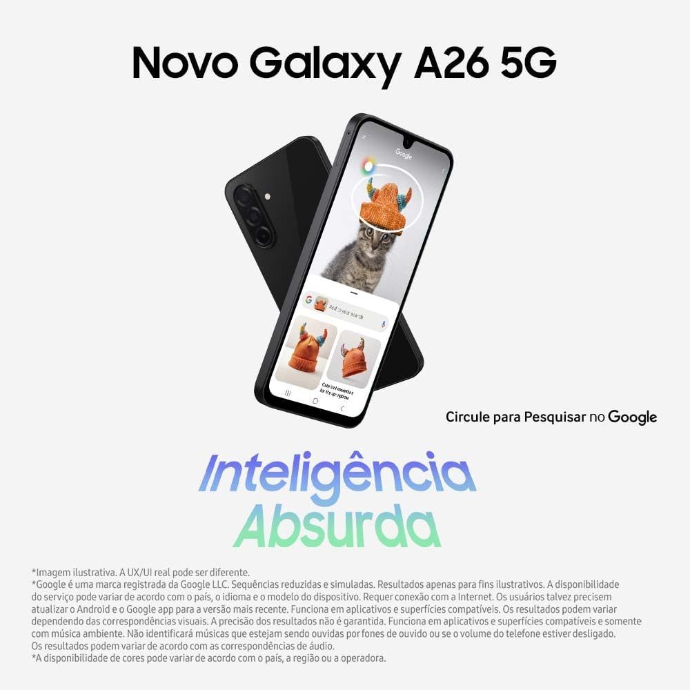 Smartphone Samsung Galaxy A26 5G 256GB 8GB RAM 6,7" – Potência, Conectividade 5G e Estilo em Um Só Aparelho Tenha desempenho, velocidade e conectividade de última geração com o Smartphone Samsung Galaxy A26 5G 256GB 8GB RAM, um modelo que oferece tudo o que você precisa para o dia a dia, com design moderno na, tela ampla e envolvente de 6,7 polegadas e suporte à tecnologia 5G, que garante downloads mais rápidos, streaming fluido e menor latência. Com 8GB de RAM e 256GB de armazenamento interno, o Galaxy A26 5G é ideal para multitarefas, jogos, redes sociais e vídeos em alta definição. A bateria de longa duração, combinada com o carregamento rápido, garante performance o dia inteiro sem preocupações. Principais Benefícios: Tecnologia 5G: navegue e baixe conteúdos com máxima velocidade 256GB de armazenamento interno: muito espaço para apps, fotos e vídeos 8GB de RAM: desempenho ágil e fluido, mesmo com múltiplos apps abertos Tela de 6,7" com alta definição: experiência imersiva para vídeos, jogos e navegação Câmeras versáteis: registre fotos e vídeos em ótima qualidade Bateria de 5.000mAh com carregamento rápido Design elegante, com acabamento moderno Sensor de impressão digital na lateral para mais segurança e praticidade Ficha Técnica : Marca: Samsung Modelo: Galaxy A26 5G Cor: Preto ou Branco Conectividade: 5G, 4G, Wi-Fi, Bluetooth, GPS, USB-C Armazenamento interno: 256GB (expansível com cartão MicroSD até 1TB) Memória RAM: 8GB Processador: Octa-Core Tela: 6,7” FHD+ Tipo de tela: PLS LCD Resolução: 2400 x 1080 pixels Câmera traseira: Múltipla (principal + ultrawide + profundidade) Câmera frontal: Ideal para selfies de qualidade Gravação de vídeo: Full HD Sistema operacional: Android com One UI Bateria: 5.000mAh com carregamento rápido via USB-C Segurança: Leitor de impressão digital lateral e reconhecimento facial Dual Chip: Sim (Nano SIM) Dimensões (A x L x P): Aproximadamente 16,5 x 7,8 x 0,9 cm Peso: Aproximadamente 195g Itens Inclusos na Embalagem: 1 Smartphone Samsung Galaxy A26 5G 256GB 8GB ; 1 Cabo USB-C; 1 Carregador rápido; 1 Extrator de chip (chave SIM); 1 Guia rápido; 1 Manual do usuário; 1 Certificado de garantia.