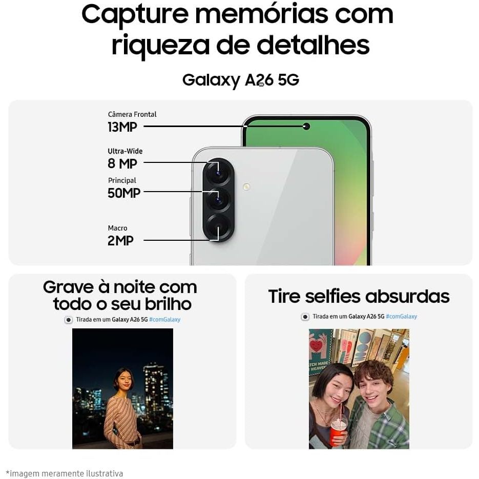 "Feito para durar e atualizado por mais tempo, o Galaxy A26 5G oferece uma experiência duradoura e segura, assegurando até 6 atualizações de sistema operacional Android e até 6 anos de atualizações de Segurança. Além disso, conta com proteção IP67, garantindo resistência à água e poeira. Para os que gostam de se manter conectados, o Galaxy A26 5G é o seu melhor companheiro de entretenimento. Registre seus momentos favoritos com a Camêra Tripla Ultra-Wide de até 50MP com edição AI e Selfie de 13MP. Capture fotos impressionantes e vídeos suaves com (OIS) estabilização óptica de imagem tenha suas fotos e vídeos nítidos e estáveis. Sua tela imersiva de 6.7"" Super AMOLED com Vision Booster, ainda permite que você assista seus conteúdos em cores realistas, e aproveite mais com uma proporção de tela maior. O novo Galaxy A26 5G, se destaca ainda mais pelas suas funções de AI, Inteligência Absurda com Circule para Pesquisar e Edição Inteligente. A Edição Inteligente permite que você crie filtros customizados com AI, o Apagador de Objetos, que é uma funcionalidade de edição de fotografias que permite selecionar e apagar objetos indesejados das imagens, além da Sugestão de Edição, que aprimora as fotos e vídeos armazenados no seu smartphone. Já o Circule para Pesquisar é um recurso alimentado pelo Google em dispositivos Galaxy que permite pesquisar rapidamente informações sobre o que você vê na tela — incluindo imagens, vídeos ou texto, usando um gesto simples com o dedo, sem precisar abrir outros aplicativos. Galaxy A26 5G é o aparelho que permite que você esteja sempre conectado, tudo isso por conta da sua bateria de longa duração de 5.000 mAh e um Carregamento Super-Rápido de até 25W, sendo assim você não precisa passar muito tempo ao lado da tomada. Você pode assistir a conteúdos, realizar diversos downloads e utilizar o seu celular sem faltar energia. Contando com um novo design com acabamento único, minimalista e elegante ainda oferecendo a opção de 3 cores para você escolher a que mais combina com o seu estilo: Verde, Preto e Branco. Com o aplicativo Smart Switch você transfere de forma fácil e prática o conteúdo do seu celular anterior (fotos, contatos, eventos do calendário, notas, configurações do dispositivo e muito mais) para o novo Galaxy A26 5G." "Circule para Pesquisar no Google Câmera Tripla Ultra-Wide de até 50MP e Edição AI Resistência à água e poeira com IP67 Feito para Durar: até 6 atualizações de Android e Segurança Tela Imersiva de 6.7"" Super AMOLED com Vision Booster Bateria de 5000 mAhs e carregamento rápido de até 25W" Memória Interna total compartilhada 256GB Suporte a Cartão de Memória Sim Tipo Cartão de Memória Suportado MicroSD (Up to 2TB) Capacidade do Cartão de Memória Até 2TB Memória RAM 8GB Memória RAM Plus até 8GB Modelo do Processador Exynos 1280 Velocidade do Processador Octa-Core 2.4GHz, 2GHz Capacidade da Bateria (mAh) 5000mAh Tipo de Bateria Ions de Lítio Voltagem Bi-Volt Compatível com Carregamento Rápido Sim (25W) Carregamento Sem Fio Não Bluetooth Bluetooth v5.3 Browser Google Chrome; Samsung Samsung Internet Conexão Wi-Fi 802.11a/b/g/n/ac 2.4GHz+5GHz, VHT80 Roteador Wi-Fi Sim NFC Sim Samsung Wallet Sim 2 Chips SIM 1 + Hybrid (SIM or MicroSD) Tipo de SIM Nano-SIM (4FF) USB USB 2.0 USB Conector USB Type-C Sistema Operacional + Versão Android | 15.0 Plataforma 64bit Loja de Aplicativos Play Store / Galaxy Apps Estamos à disposição para esclarecer qualquer dúvida. Atenciosamente, Equipe NegociuN!