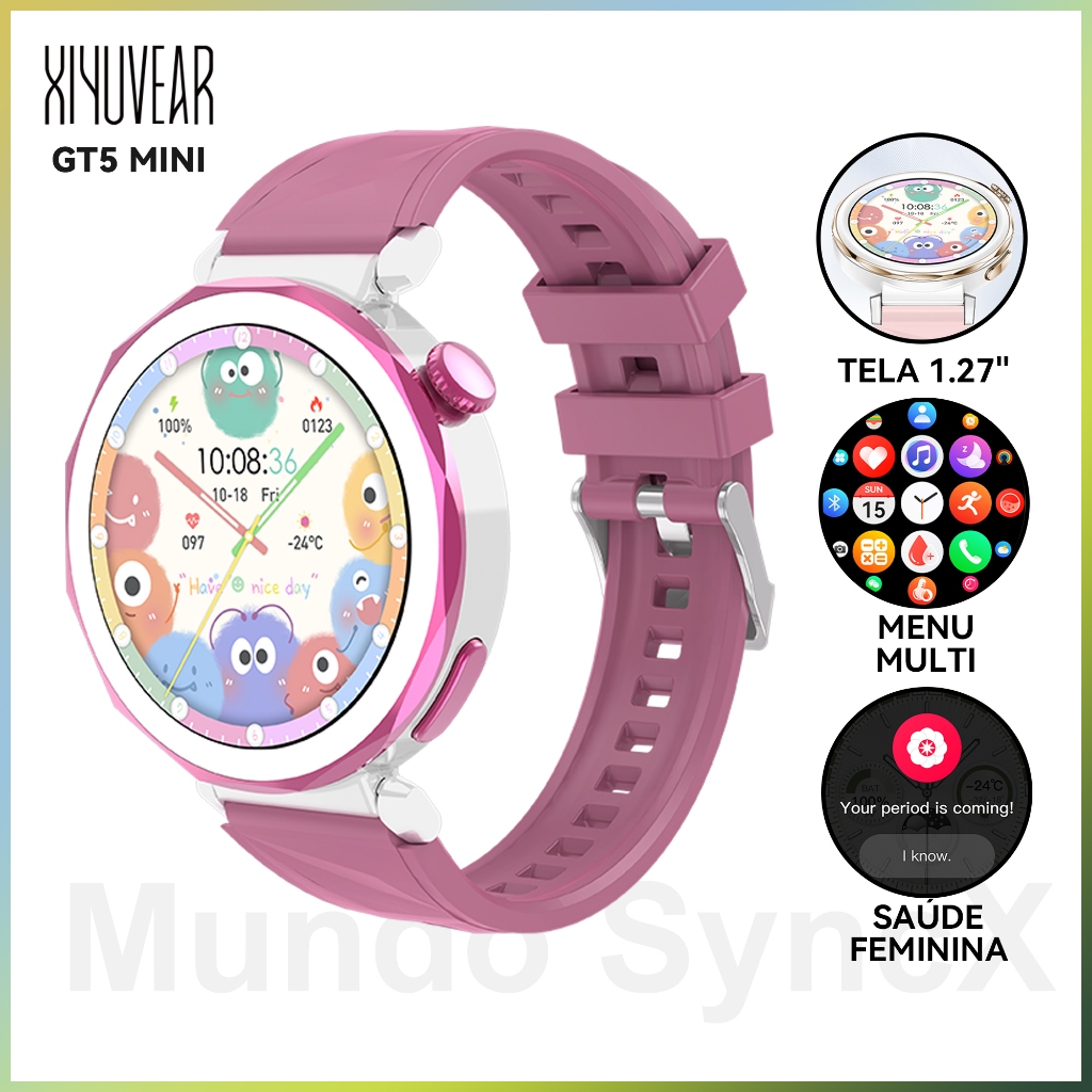 Smartwatch Relogio XiYuVear GT5 Mini, Chamada BT, Monitoramento Saúde, Tela HD, Estilo Fashion