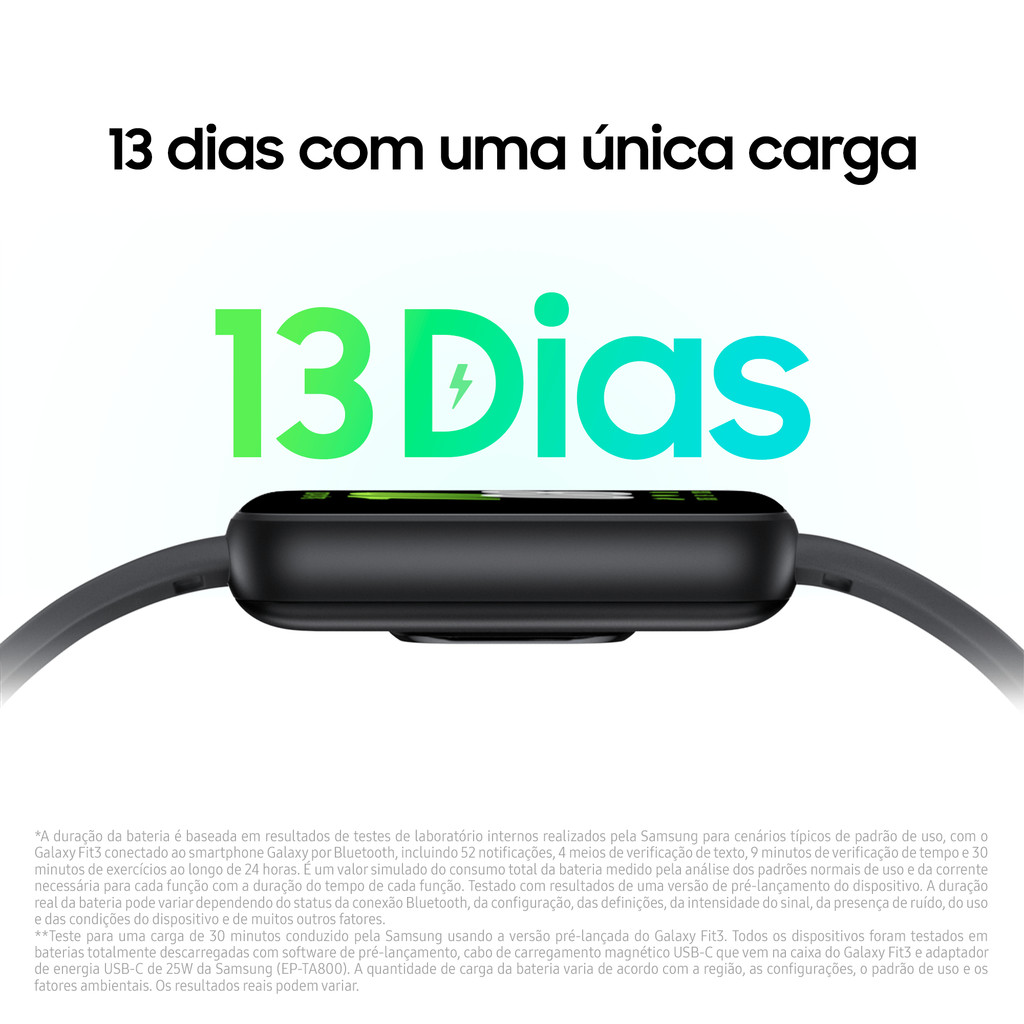 O Novo Galaxy Fit3 possui um Design esportivo e ergonômico em alumínio, que o deixa bem confortável e estiloso no seu punho. Possui um grande display de colorido e interativo, e é ideal para o monitoramento das práticas esportivas e de bem-estar. O Fit3 te ajuda a ter uma vida mais saudável, com o controle avançado da qualidade do sono e através do monitoramento dos seus exercícios (são 6 modalidades de esportes detectadas automaticamente, e 101 tipos programáveis). Possui detecção de queda e Alerta SOS. Além disso, com ele você recebe e responde suas notificações de chamadas e mensagens direto no punho. A bateria do seu Galaxy Fit3 possui uma longa duração, que pode chegar a 13 dias de autonomia de bateria. Ele é resistente contra água suportando até 50m (5ATM) de profundidade, e também resistente contra poeira (IP68).