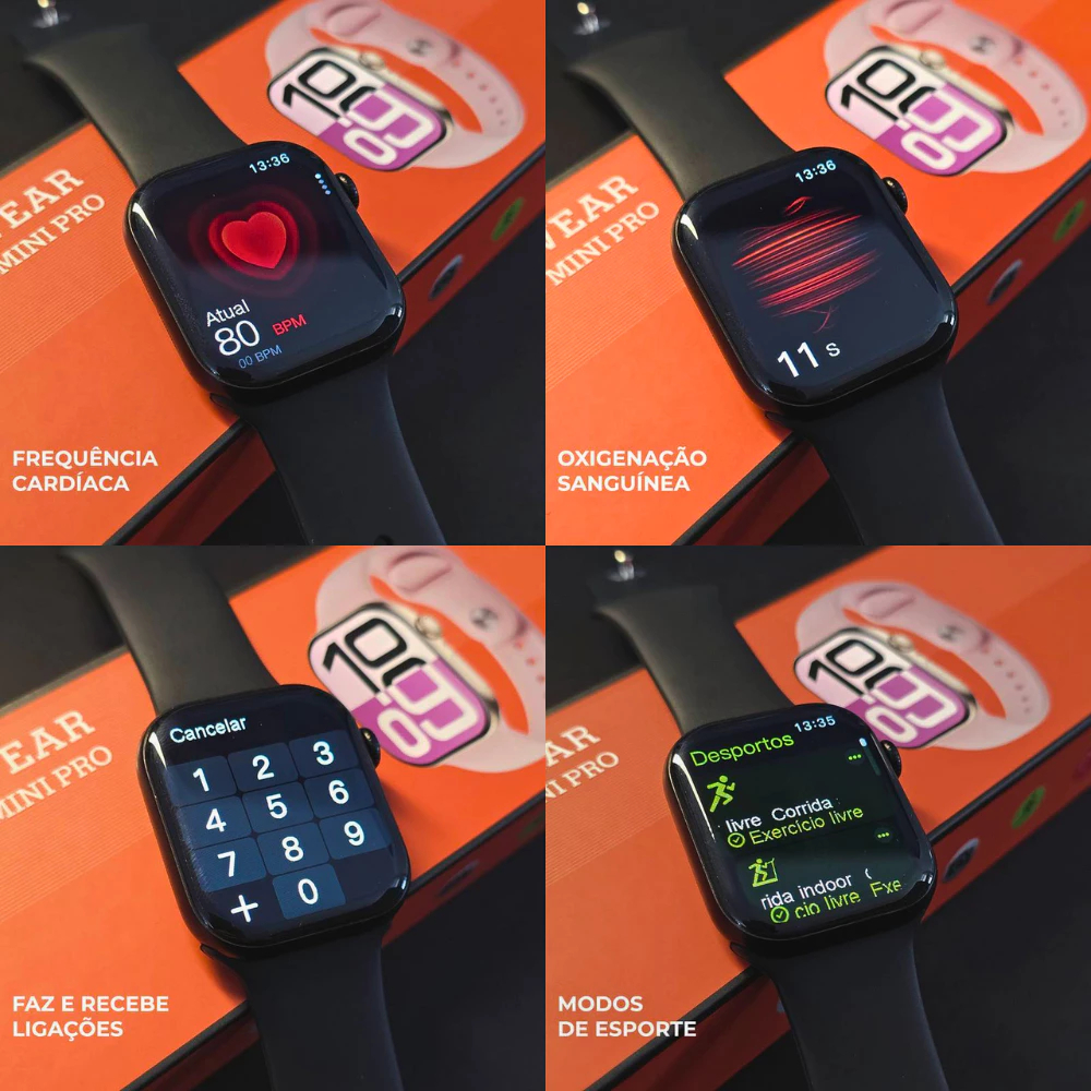 • Todos os Smartwatch vão com selo de garantia, não pode retira-los enquanto a garantia estiver vigente. • Garantia não coberta por defeitos causados pela água. • NÃO USAR FONTES DE CARREGAMENTO ACIMA DE 5V e 1A. (Recomendamos utilizar USB de computador/TV ou similar para conservar a bateria do Smartwatch) • O Smartwatch chega com pouca ou sem bateria, é necessário dar a primeira carga completa no mesmo antes de utilizar para não danificar a bateria. • Se não conseguir configurar principalmente notificações entre em contato com a gente pelo chat para auxiliar. FUNÇÕES: • Novo Sistema Micro OS 10 (Atualizado). • Ilha Dinâmica (Mostra funções na ilha). • Atende Chamadas por Gestos. • 1GB de memória interna para Baixar músicas. • ChatGPT. • Medidor de Decibéis. • Menu Colmeia. • Dois Auto Falantes. • Faz e recebe ligações. • Recebe notificação de aplicativos de redes sociais. • Bloqueio por senha. • Bússola de alta precisão. • Pedômetro. • Funções esporte. • Monitor de sono. • Controle menstrual • Conecta direto com fone de ouvido bluetooth • Informações push: notificação de mensagens recebidas síncrona do centro de notificação em seu telefone • Chamadas: fazer & atender chamadas depois de conectar bluetooth com telefone inteligente • Tecnologia: always play - onde você tem uma tela acessa o tempo todo de sua preferência • Comando de voz compatíveis: Alexa, Siri e Google • NFC (destravamento de portas que utilizam a tecnologia) • Assistente de voz • Monitor de sono • Trava para Trocar Pulseira • Treinamento de respiração • Música de Bluetooth • Treino • Tempo • Cronômetro relógio de pulso • Despertador relógio despertador • Temporizador • Câmera Encontre o telefone • Calculadora • Telefone: Discagem, atende ligações, é possível falar diretamente no relógio, Lista telefônica, recebe SMS • Player de Música: pode controlar suas músicas • Funções Esportes: Caminhada, Corrida, Alpinismo, Ciclismo, Basquete, Badminton, Futebol, Ioga, Tênis de Mesa , Pular Corda, Tênis e Levantamento de Peso ESPECIFICAÇÕES DA TELA: -Tela Gigante de 1.85mm. -Taxa de resposta de 60Hz. -Densidade de pixel 340PPI. -Resolução da tela 390*450px. -Tela 64-bit (ótima saturação de cores). -Tela sensível ao toque: multi-toque totalmente apto. -Capacidade da Bateria: 180-220mah (carrega em 2h). Compatível Android 4.4 e acima, IOS 9.0 e acima. Perguntas frequentes: 1. Este relógio é à prova d'água? Resposta: Ele é resistente a agua categoria IP68 de resistência a chuvas, suor, respingos de água e poeira. Embora o IP68 garanta maior resistência à água, não significa que os aparelhos sejam à prova d’água, pois os testes são feitos em laboratório com ambientes controlados. As condições que você pode expor o aparelho, podem ser muito diferentes daquelas realizadas nos laboratórios, como a pressão ou temperatura da água. 2. Recebe notificações de redes sociais? Resposta: Sim, incluindo mensagens de texto e atualizações. 3. Quanto tempo dura a bateria? Resposta: Entre 12hs a 5 dias dependendo do uso. 4. Tem garantia? Resposta: Sim, garantia de 1 mês contra defeitos de fabrica. Cores Disponíveis: - Rose Gold com pulseira silicone Rosa - Prata com pulseira silicone Branca - Preto com pulseira silicone Preta O que vem na caixa: -1x W10T Pro Mini 42mm -1x Pulseira Silicone -1x Carregador por indução -1x Manual de instrução que pode ser acessado pelo QRCode da caixa
