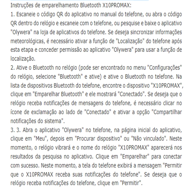 Relógio Inteligente X10 Pro Max Descrição do Produto: O X10 Pro Max é um relógio inteligente de alto desempenho, projetado para oferecer tecnologia avançada e design moderno em um dispositivo compacto e elegante. Com uma tela grande e recursos inteligentes, este relógio é ideal para quem busca praticidade, saúde e conectividade no dia a dia. Especificações Técnicas: Dimensões: 45 x 43 x 11.8 mm Material da Caixa: Titânio, garantindo resistência e leveza. Material da Pulseira: Silicone, confortável e durável. Tamanho da Pulseira Compatível: 44/45/49 mm Carregador: Carregador magnético sem fio. Tela: Tela LCD HD de 2.19 polegadas. Resolução da Tela: 425 x 518 pixels. Sistemas Compatíveis: Android 5.0+ e iOS 8.0+. Modo de Conexão: Bluetooth duplo. Funcionalidades: Monitoramento de Saúde: Frequência cardíaca, oxigênio no sangue (SpO2), treinamento respiratório e monitoramento de sono. Atividades Físicas: Vários modos de esporte, contador de passos e lembretes para se movimentar após longos períodos sentado. Tecnologia Inteligente: Assistente de voz com IA, BT Music, discador, alarme, cronômetro e calculadora. Conectividade: Receba notificações e sincronize dados diretamente no seu relógio. Interface Personalizável: Seleção de Brilho e Modo Esportivo: Ajuste o brilho da tela e escolha entre diferentes modos de esporte diretamente no relógio. Tela Deslizante: Acesso rápido a funções como Bluetooth, lanterna, ajuste de brilho, modo esportivo, seleção de sistema e música Bluetooth. Lembretes de Sono: Monitoramento inteligente do sono para melhorar sua qualidade de vida. Tela Lateral Direita: Exibe informações como clima, QR code, data e 4 menus rápidos (passos, frequência cardíaca, lembretes de sono e configurações). Resistência à Água: O X10 Pro Max é resistente a respingos de água e suor, mas não é à prova de vapor, água morna ou quente. Não é recomendado o uso durante banhos, lavagem de louça ou natação. Como Conectar: Baixe o aplicativo correspondente na loja de aplicativos do seu celular. Ative o Bluetooth no relógio e no smartphone. No seu celular, procure por dois dispositivos Bluetooth com nomes como "watch" ou "pro max" e conecte ambos para garantir a sincronização completa. Atenção: O botão "Procurar Celular" no relógio não é para conexão Bluetooth, mas sim para localizar o relógio. Ao pressioná-lo, o celular emitirá um som ou vibrará. O X10 Pro Max é o parceiro perfeito para quem busca um estilo de vida mais saudável, conectado e organizado. Com sua tela ampla, funcionalidades avançadas e design sofisticado, ele está pronto para acompanhar você em todos os momentos. Garanta já o seu!
