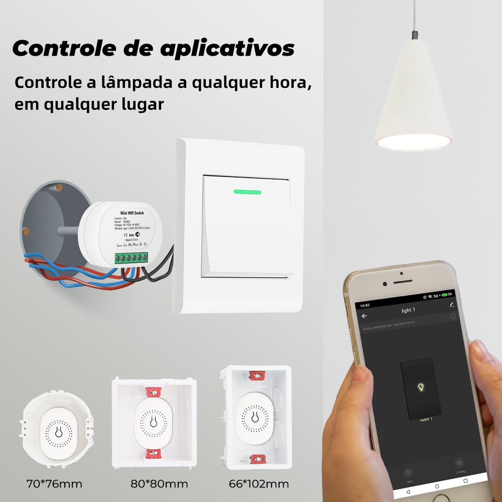 Descrição do produto em inglês após português Ponto de venda único 1. Wifi+Bluetooth modo duplo Conecte-se à rede mais rápido. A velocidade de rede de conexão é de 2 vezes mais rápido que apenas Wifi 2.WIFI+433: Pode ser controlado pela tuya APP, alto-falante de voz, podendo ser controlado por interruptor sem fio e controle remoto, que é mais conveniente 3. A mini figura pode ser diretamente instalada na caixa inferior do interruptor sem colocar no teto, que é conveniente para manutenção e funcionamento 4.16A de alta potência atende o poder dos aparelhos elétricos mais seguros de 10A 5. Suporte 2 controle de maneira: pode ser usado com o interruptor mecânico de controle duplo antes de ligar para a casa 6. Uso com Amazon Echo e Google Home, Genie Tmall 7. Compartilhar com família para controle comum 8.3 estados: padrão ou desligado, ou estado de memória 9. Contagem regressiva, timing, função compartilhamento Especificações principais: Tensão de entrada: 100-240V 50/60Hz Corrente máxima de carga: 16A Padrão WiFi: 2.4GHz 802.11 b/g/n Frequência de trabalho: 433,92MHZ Código de aprendizagem: EV 1527 Nome do aplicativo: Tuya / Smart Life Tamanho: 59*42*20mm Aviso: 1. Produtos da série Tuya não suportam todos os dispositivos Samsung. 2. Bluetooth só é utilizado para conexão de sinal de rede, Bluetooth não pode ser usado sozinho. WIFI+Bluetooth é mais estável 3. O interruptor de parede deve ser mantido aberto para garantir que o interruptor on-off seja energizado antes que possa ser utilizado 4.Este link não inclui interruptor sem fio ou controle remoto, caso necessário, pode entrar em contato com o atendimento ao cliente para compra ************************************************** Description: Unique selling point 1. Wifi+Bluetooth dual mode Connect to the network faster. The connection network speed is 2 times faster than only Wifi 2.WIFI+433: It can be controlled by tuya APP, voice speaker, and can be controlled by wireless switch and remote control, which is more convenient 3. The mini figure can be directly installed in the switch bottom box without placing it on the ceiling, which is convenient for maintenance and operation 4.16A high power meets the power of most electrical appliances, safer than 10A 5. Support 2 way control: can be used with the dual control mechanical switch before connecting to the home 6. Use with Amazon Echo and Google Home, Tmall Genie 7. Share with family for common control 8.3 states: default on or off, or memory state 9. Countdown, timing, sharing function Main specifications: Input voltage: 100-240V 50 / 60Hz Maximum load current: 16A WiFi standard: 2.4GHz 802.11 b/g/n Working frequency: 433.92MHZ Learning code: EV 1527 Application name: Tuya / Smart Life Size: 59 * 42 * 20mm Notice: 1. Tuya series products do not support all Samsung devices. 2. Bluetooth is only used for network signal connection, Bluetooth cannot be used alone. WIFI+Bluetooth is more stable 3. The wall switch must be kept open to ensure that the on-off switch is energized before it can be used 4.This link does not include wireless switch or remote control, if necessary, you can contact customer service to purchase
