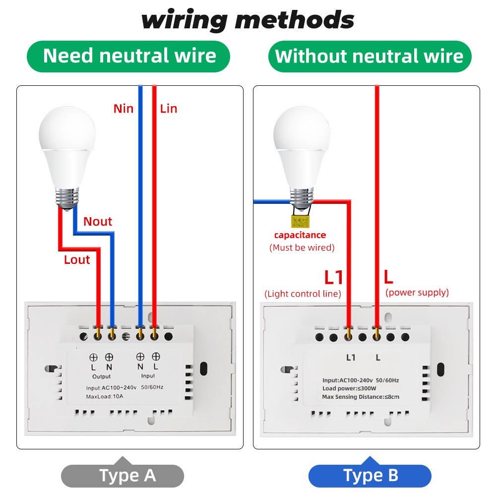 Descrição do produto em inglês após português Preste atenção às opções Tipo B: Nenhum interruptor neutro é necessário, Tipo A: Linha neutra é necessária Característica principal: 1. [Sensagem Infravermelho]: Não precisa tocar No interruptor, operação remota, mais segura e saudável 2. [Não Linha neutra/necessada linha neutra]: indicado para novas residências, casas velhas, pode ser instalada 3. [Evite Misoperação]: distância de sensagem de 8cm, evite pedestrianos ou animais por meio de misoperação 4.【Anti-riscos, fácil de esfregar】: Painel de vidro temperado, mais fácil de limpar, prevenir riscos 5.【Localização sugerida】 Instalação de cozinha: evitar óleo em mãos Instalação do banheiro: evitar tocar coisas implacáveis nas mãos Instalação da porta: Evite trazer coisas exteriores inclimas em casa, que afetará a saúde da família Instalação do quarto: Pode ser operado por acenar à noite, não precisa tocar na posição exata, aberto As luzes são muito convenientes Especificações Principais: Tensão de entrada: 100-240V 50/60Hz Fiação: Neutro não é necessária/Neutro Alimentação: 3W-300W (tipo B precisa ser instalado com capacitores, o produto inclui capacitores.) Tamanho: 118*74*36mm Aviso: Tipo B precisa instalar um capacitor: Para garantir uso estável, por favor instalar o capacitor de acordo com o manual, o local de instalação do capacitor está no bulbo, não na parte traseira do interruptor ************************************************** Pay attention to options Type B: No neutral switch is required, Type A: Neutral line is required main feature: 1. [Infrared Sensing]: No need to touch the switch, remote operation, safer and healthier 2. [No neutral line/need neutral line]: suitable for new homes, old houses, can be installed 3. [Avoid misoperation]: 8cm sensing distance, avoid pedestrians or pets through misoperation 4.【Anti-scratch, easy to scrub】: Tempered glass panel, easier to wipe, prevent scratches 5.【Suggested location】 Kitchen installation: avoid oil on hands Bathroom installation: avoid touching unclean things on your hands Doorway installation: Avoid bringing unclean outdoor things into the house, which will affect the health of the family Bedroom installation: It can be operated by waving at night, no need to touch the exact position, open Lights are very convenient Main Specifications: Input voltage: 100-240V 50/60Hz Wiring: Neutral is not required / Neutral is required Power: 3W-300W (type B needs to be installed with capacitors, the product includes capacitors.) Size: 118*74*36mm Notice: Type B needs to install a capacitor: In order to ensure stable use, please install the capacitor according to the manual, the capacitor installation location is at the bulb, not on the back of the switch