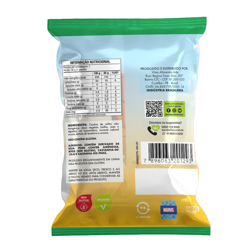 Desfrute de uma explosão de sabor mágico com o Snack sabor Cheddar Disney sem glúten. Esta irresistível delícia oferece o equilíbrio perfeito entre o característico sabor do cheddar e a diversão encantadora da Disney, tudo em uma opção livre de glúten. Cada mordida é uma jornada sensorial, onde a magia se encontra com o paladar, proporcionando um momento de alegria para crianças e adultos. Embalado com ingredientes de alta qualidade e a qualidade que você espera da Disney, este snack é a escolha perfeita para quem busca uma experiência saborosa e sem glúten. INGREDIENTES: Canjica de milho não transgênico, óleos vegetais (milho, soja e algodão), sal hipossódico, corante natural urucum, extrato de levedura e aroma. ALÉRGICOS: CONTÉM DERIVADO DE SOJA. PODE CONTER AMÊNDOA, AVEIA (SEM GLÚTEN), CASTANHA-DE-CAJU E CASTANHA-DO-PARÁ. NÃO CONTÉM GLÚTEN. SEM GLÚTEN, VEGANO, ASSADO.