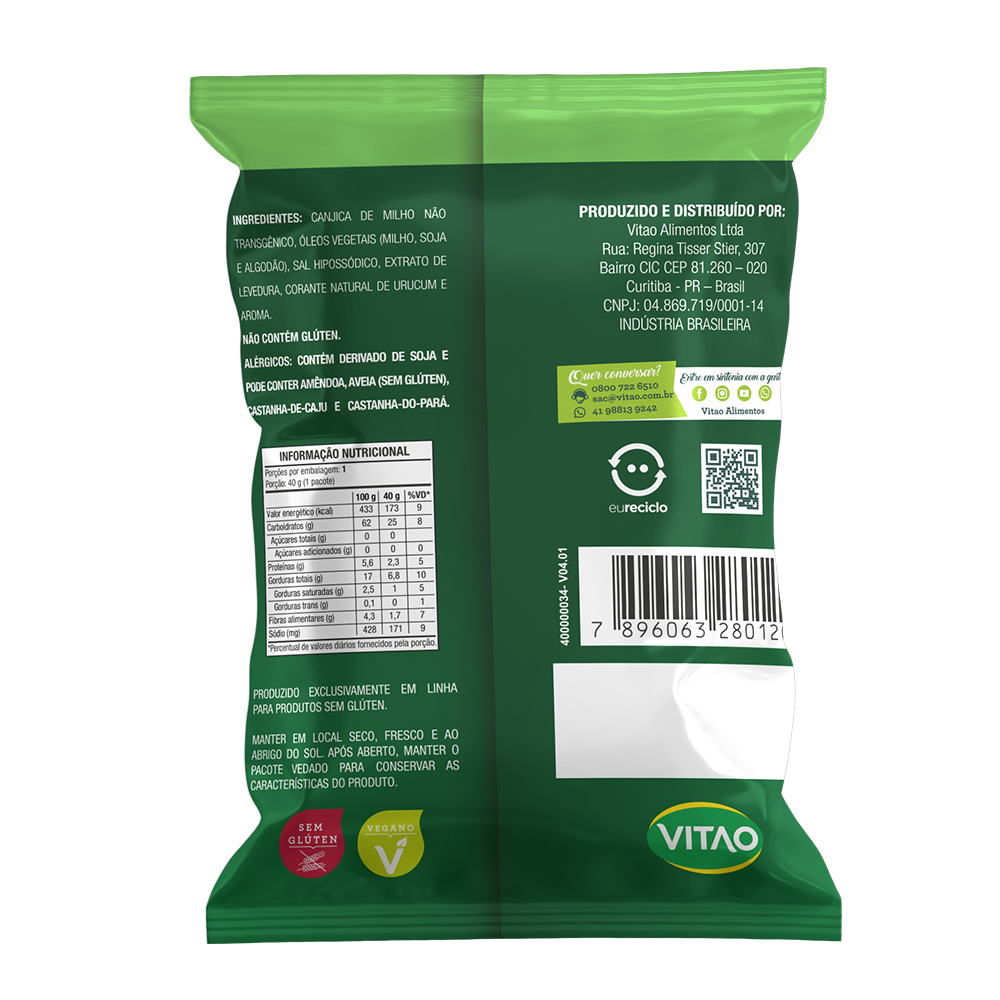 O snack sem glúten sabor ervas finas da Vitao é uma opção deliciosa e nutritiva para quem busca um lanche saudável, perfeito para pessoas com restrições alimentares. Além disso, ele é vegano, ou seja, não contém nenhum ingrediente de origem animal. Uma combinação equilibrada de crocância e sabor. Pode ser consumido como um lanche prático e rápido, ideal para saciar a fome entre as refeições. Aproveite esse snack saboroso e nutritivo, feito com ingredientes de alta qualidade, e desfrute de um momento de prazer sem abrir mão de uma alimentação consciente e saudável. INGREDIENTES: Canjica de milho não transgênico, óleos vegetais (milho, soja e algodão), sal hipossódico, extrato de levedura, corante natural de urucum e aroma. ALÉRGICOS: CONTÉM DERIVADO DE SOJA E PODE CONTER AMÊNDOA, AVEIA (SEM GLÚTEN), CASTANHA-DE-CAJU E CASTANHA-DO-PARÁ. NÃO CONTÉM GLÚTEN. SEM GLÚTEN, VEGANO.