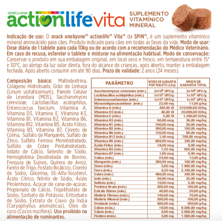 Cuide da saúde e vitalidade do seu cão com Actionlife Vita! 🐾 Um snack mastigável desenvolvido para contribuir com o bem-estar diário dos pets. Sua fórmula rica em vitaminas, minerais, aminoácidos e probióticos auxilia na manutenção da imunidade, energia e equilíbrio digestivo dos cães de todas as idades. ✅ Com vitaminas e minerais essenciais ✅ Contém aminoácidos e probióticos ✅ Contribui para a imunidade e energia ✅ Fácil de oferecer: formato em snacks mastigáveis ✅ Indicado para cães filhotes, adultos e idosos Peso: 240g (embalagem com 4 unidades de 60g) Contém aproximadamente 30 snacks por caixa (por embalagem de 60g) Garanta mais saúde, disposição e qualidade de vida para o seu melhor amigo! 🐶